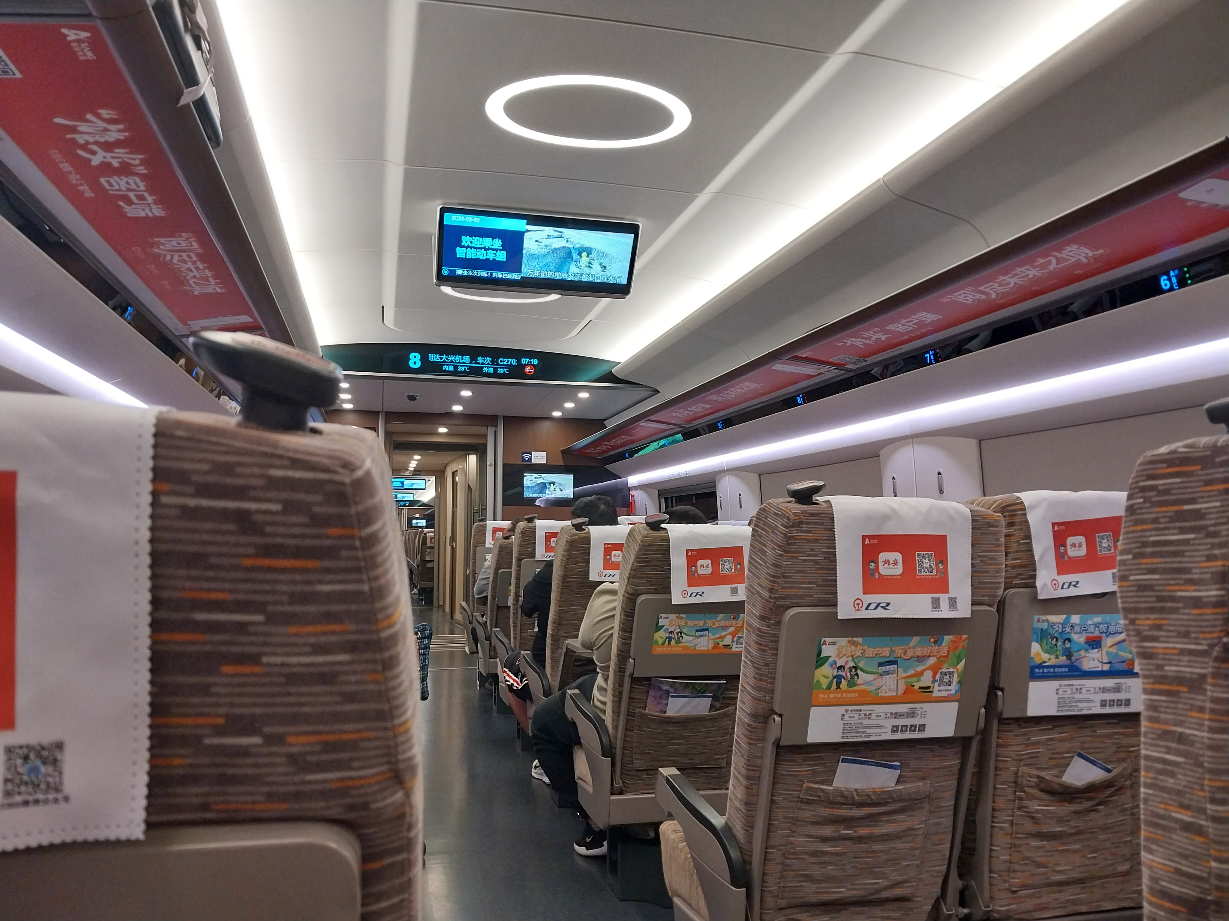 В этом году впервые посетил Китай. Одной из целей поездки было - прокатиться на скоростном китайском поезде. Изначально планировалось проехать по маршруту Пекин-Гонконг, но решил все же поосторожничать и этот участок преодолеть самолетом. Для тестовой поездки выбрал коротенький маршрут Дасин Аэропорт - Пекин Дасин. Как оказалось - поезд это, пожалуй, самый выгодный по соотношению цена/комфорт/скорость вариант добраться из аэропорта Дасин в центр Пекина. Билет на взрослого 144 рубля (+ 111 кажется рублей комиссия trip.com), детский дешевле. 2 класс, билеты продаются с указанием мест, но самостоятельно номер места выбрать не получается (по крайней мере на trip.com). Дата поездки 2 июн 25. Время в пути 11 минут. Станция Дасин Аэропорт расположена прямо в аэропорту, на уровне B1. На полу нарисованы дорожки как пройти к своему поезду. В зависимости от путей на которые приходит поезд, есть несколько "залов ожидания". Чтобы попасть в зал, проходим через рамку, сумки через ленту. Чтобы из зала попасть на платформу - проходим турникеты, китайцы прикладывают к считывателю свои ID карты, иностранные граждане передают паспорта сотруднику, который их сканирует телефоном ли каким-то еще гаджетом и проверяет таким образом что данный гражданин действительно купил билет на данный поезд. Эти турникеты открываются минут за 10 до прибытия поезда. Платформа огорожена от путей стеклянными стенами с раскрывающимися дверьми, как в метро, но не совсем. Если в метро эта стенка почти вплотную прилегает к дверям вагона и двери в стенке и в вагоне открываются синхронно, то здесь она, открываясь, просто запускает тебя на "внешнюю" часть платформы, по которой ты уже идешь чтобы войти в дверь вагона. Т.е. двери вагона не полностью совпадают с открытыми дверьми на платформе, тем не менее над каждой дверью на платформе отображается номер вагона, который за ней остановился. Вагон по компоновке похож на Ласточку, но сиденья мне показались покомфортнее, на спинках откидные столики, на окнах опускающиеся снизу шторки. Туалет достаточно просторный, помимо туалета в проходе, в специальной нише присутствует умывальник (когда, интересно, в в российских вагонах догадаются ставить отдельные умывальники в вагоне, а не только внутри туалетов). В вагоне присутствует проводник, но билеты/паспорта в этот раз не проверял, наверное из-за слишком короткого участка. На данном участке поезд особо не разгонялся, ехал примерно на уровне той же Ласточки, видимо свою высокоскоростную сущность он показывает уже после выезда из города. В вагоне очень тихо, нет никаких ни технических шумов, ни шумов от пассажиров (вопреки расхожему мнению что китайцы ведут себя очень шумно всегда). В общем, вывод сделал такой что часов 8-9 в таком поезде проехать можно спокойно, и моя давняя мечта проехать по жд маршрут Иркутск-Паттайя вполне осуществима :-)