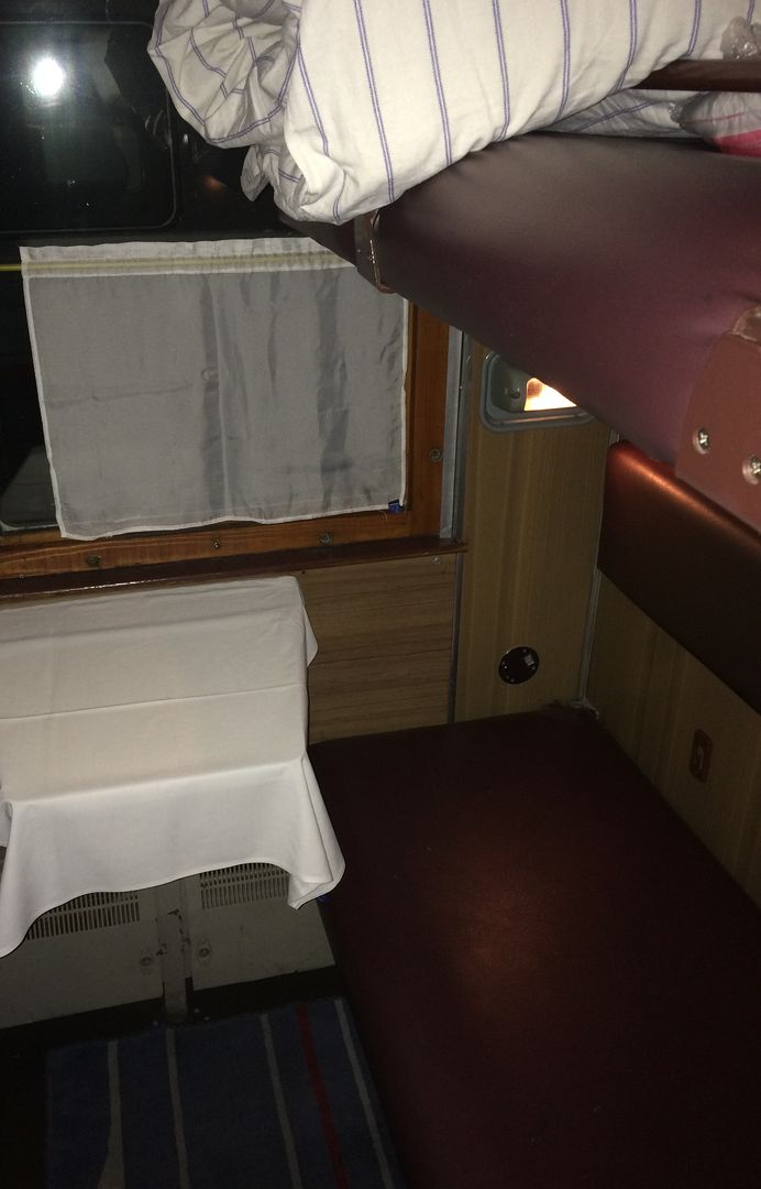 В поезде очень душно, топят на убой. Вагоны внутри средней чистоты, но матрасы и подушки просто рассыпаются! По всему вагону летает пух и пыль от матрасов. Постельное белье грязное и мокрое. В поезде есть вагон, в котором имеется что-то типа буфета, где продают продукцию с почти истекшим сроком годности и натурально стоят круглые белые столы и сидушки как в летних кафе! Не хватает только зонтика.