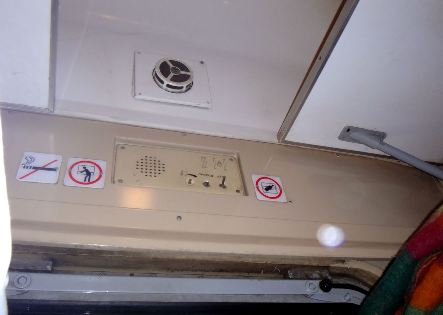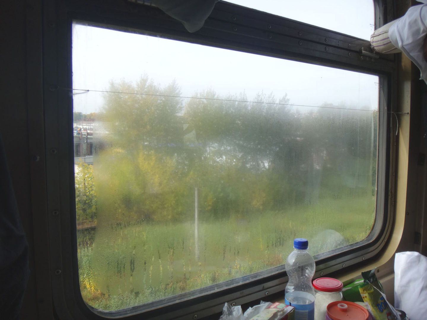 И вообще, вагон оказался 54-вольтовым без кондиционера (думал все они с кондиционером). У меня еще к тому же был убитый запотевший изнутри стеклопакет, через который было неважно видно. В целом вагон довольно раздолбанный (как проводница очень нехотя ответила - 79 года выпуска), все латаное-перелатаное. На окнах ни занавесок, ни даже штатных опускных штор.