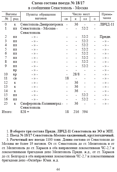 Плацкарт данного поезда (№17 Москва-Севастополь) честно говоря поганый... Много раз ездил на этом поезде, а также на других составах украинского формирования (203) Вагоны в составе-старый аммендорф(купе)и советские плацкартники 70-х годов постройки... в основном после кап.ремонта, с замененными стеклопакетами, но от этого не легче,так как в жару, в таких вагонах можно надеяться только на приточную вентиляцию, которая далеко не всегда исправна, ибо форточки в этих окошках открываются только сантиметров на 10 максимум... Самые нормальные составы до Севастополя это: №233-234, а также №257-258 оба эти состава московского формирования, недавно на Курском наткнулся на 233 поезд в составе которого были св. и купейные вагоны от "Николаевского экспресса" в очень неплохом состоянии... это меня очень порадовало.... Единственный + 17 поезда, это время его прибытия в Севастополь, в остальном советую обратить внимание на 233-234, а также 257-258... если не принципиален пункт назначения, то до Симферополя ходит хороший фирмач московского формирования № 29-30 "Тургенев" прибытие в Симфер, приблизительно в 7 утра...