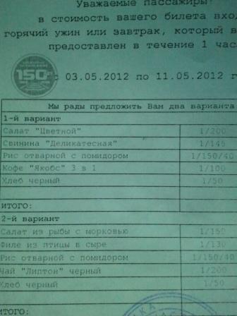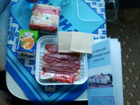 Вчера проехался в 8 вагоне СВ. Маршрут: Витебск-Москва. Вагон чисто белорусского производства, скорее всего переделанный из купейника, сделанный под ТВ3.Под полку невозможно поставить чемодан, еле запихнул его наверх. Видимо пассажиры СВ ездят только с портмоне или с портфелем. Сверху по бокам 2 дополнительные багажные полки. Бельё уже лежало на полках. Сначала подумал, что это покрывало - оказалось, что это бельё из плотного льна. Такое вижу впервые. При посадке проводница предложила 2 варианта ужина или сухпаёк (фото прилагаю). Принесли из ВРа через 30 минут.Питание вполне сносное. По телевизору можно смотреть диски(за отдельную плату у проводницы).В вагоне 2 туалета: один био, другой с видом на рельсы. Оказывается у белорусов, принято на всякий случай оставлять хотя бы один работающий туалет. Особых усилий относительно уборки замечено не было. Оценка поезду 8 баллов из 10.