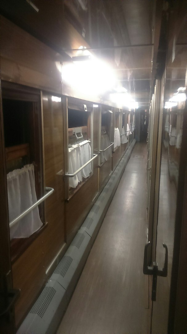 Ну так как мой вагон находился в "голове" состава, мне представилась возможность осмотреть весь состав пока шел. Ну плацки все старые КВЗ помоему. О биотуалете или кондёре речи никакой, везде были открытые окна. Купешки Аммендорфы. Краска на всех вагонах обшарпана. Так же есть купешки, которые с деревянными рамами, в них в коридорах эти окна открыты вниз. (Надеюсь доходчиво объяснил ::-D: ) Так же пока шел в ресторан, посчитал, что из 6 вагонов купе только в 3 есть кондёр.