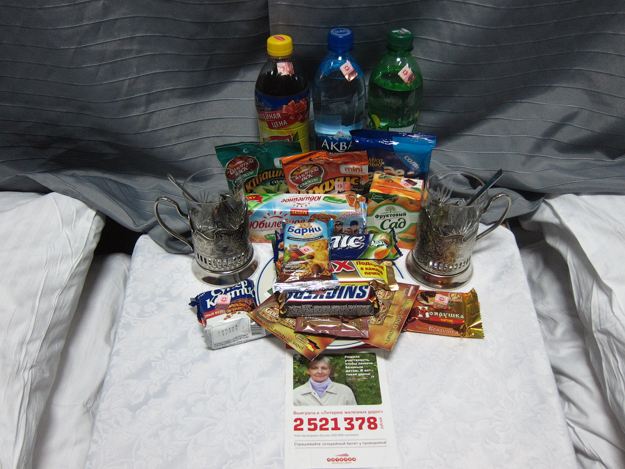 Вагон СВ №9 оказался родным тверским СВ вагоном середины 2000-х гг. с ореховым пластиком. При посадке в купе уже поджидал неоднократно описанный сангиг набор и набор прессы бизнес-класса: декабрьский выпуск журнала "Саквояж. СВ" и свежие пятничные выпуски "Коммерсанта", "Комсомольской правды" и "Известий". Бельё - привычное СВшное (в полоску от Мастер-Клининга), одеяла заправлены. На столе две чашки с блюдцами и мини-поляна из неходового товара по отдельному прейскуранту: