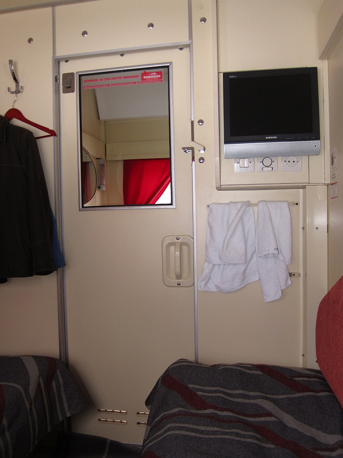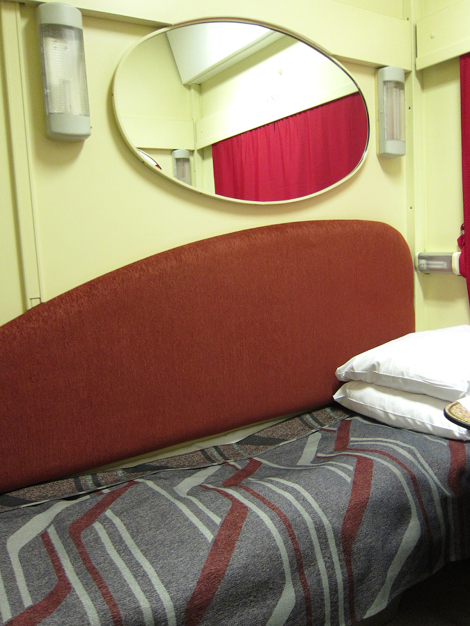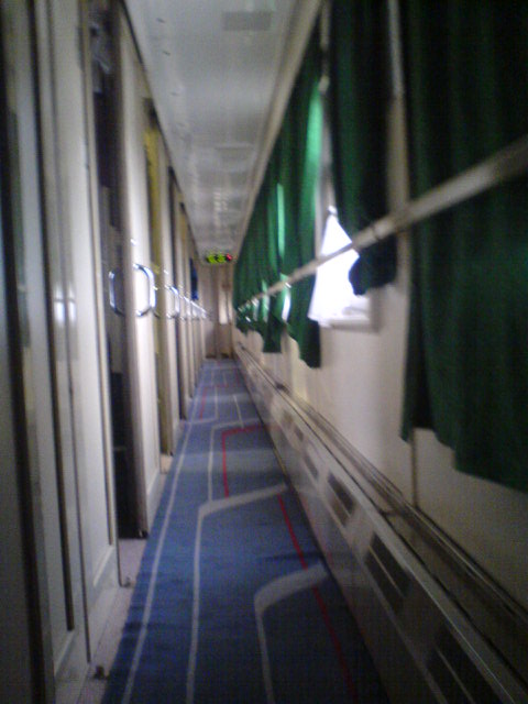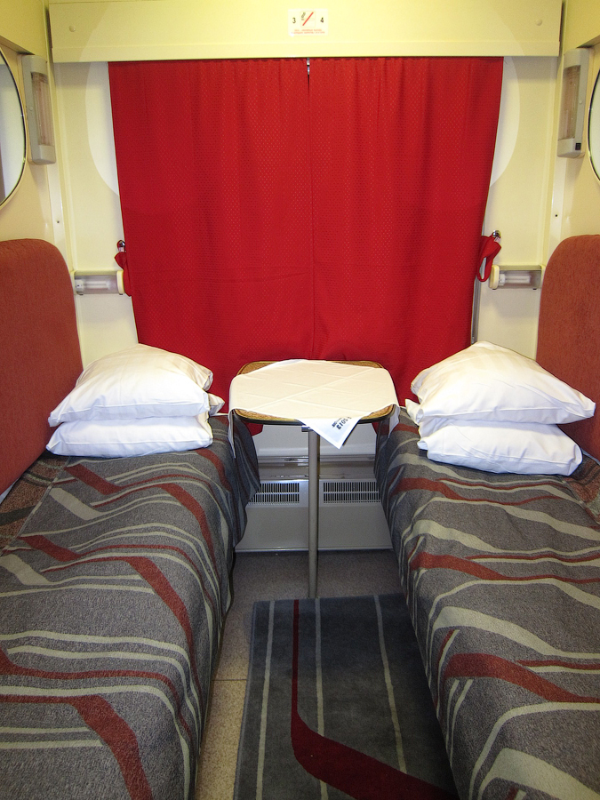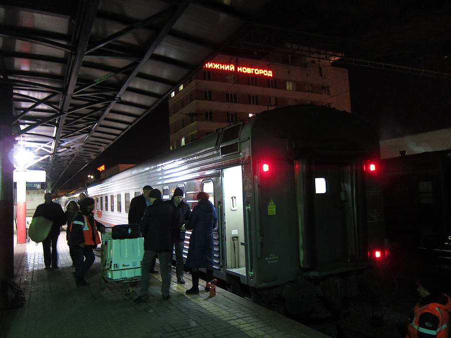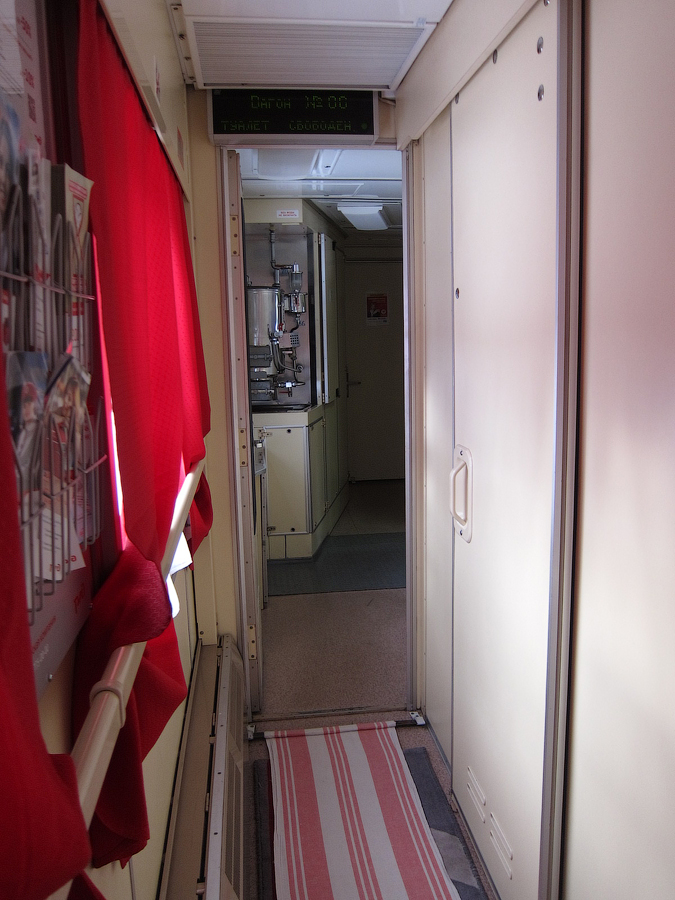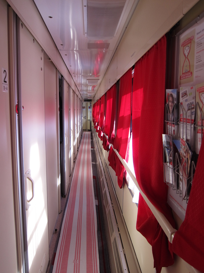 На посадке проводница "порадовала" тем, что из купе только что вышли трамвайщики, приехавшие в Нижний из Нерезиновой, поэтому придётся подождать заправки постелей. Причем проводница взяла билет лишь на первую часть маршрута (НН - Пермь) и заявила, что предупредит сменщицу, чтобы она забрала билет на вторую часть маршрута (Пермь - Екатеринбург) на следующий день. Вторым пассажиром в купе оказался сотрудник 6-й должностной категории старшего состава ОАО "РЖД" (в форме), ехавший из Нижнего до Кирова. Сам вагон СВ явил собой родной тверской СВ вагон 2006 года рождения, содержавшийся в должном для фирмача состоянии, с ярко красными занавесками в коридоре и купе: