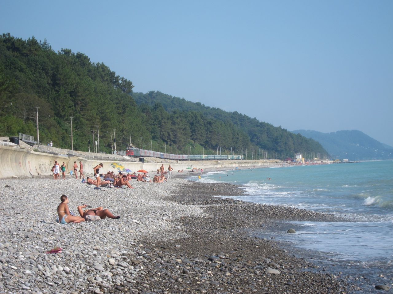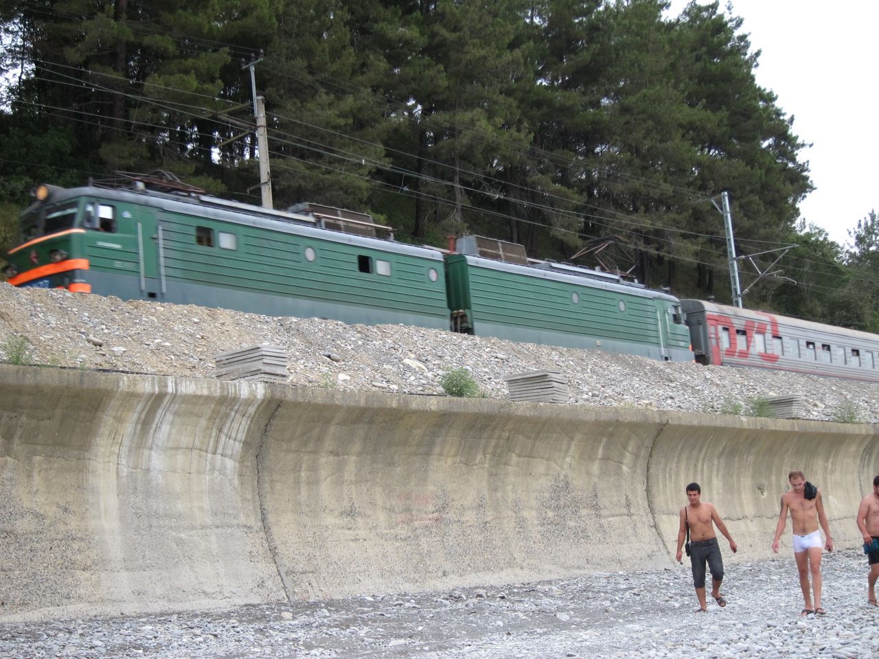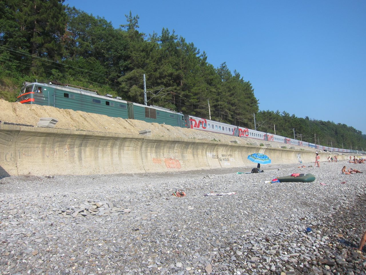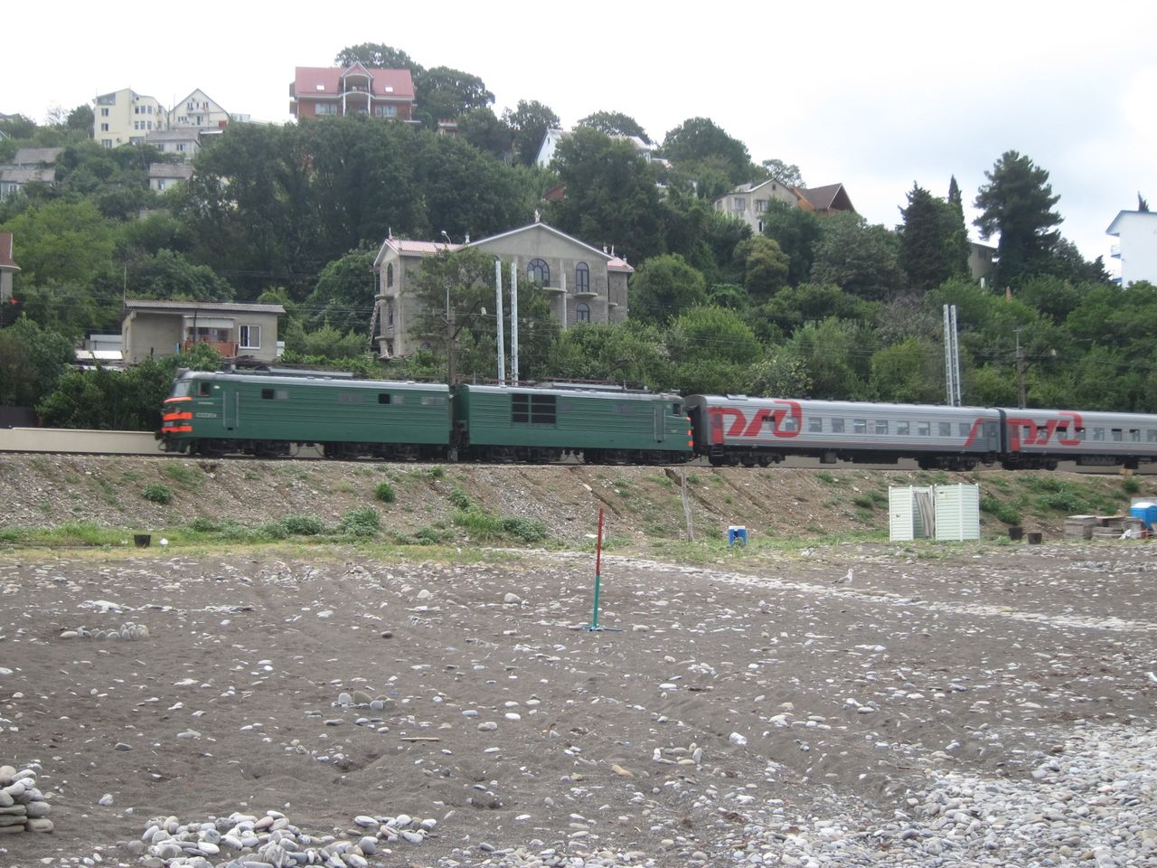 Поезд 088С Адлер - Нижний Новгород прибывает на ст. Лазаревская. Справа стоит состав поезда 012Ч Москва - Адлер.