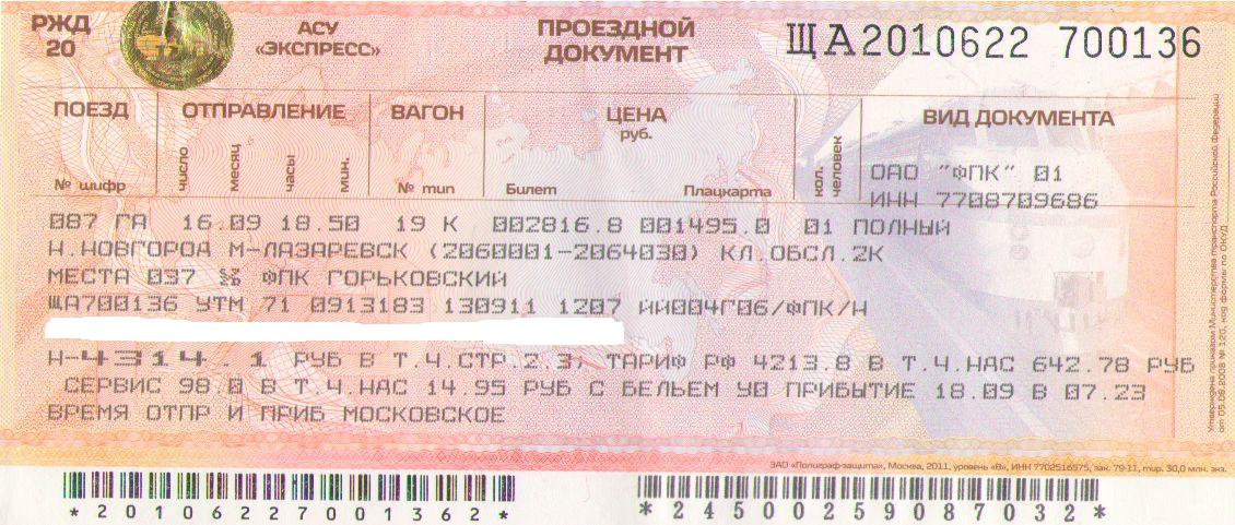 Поездка 16 - 18 сентября 2011 года по маршруту Нижний Новгород - Лазаревская, вагон 19К, место 37.