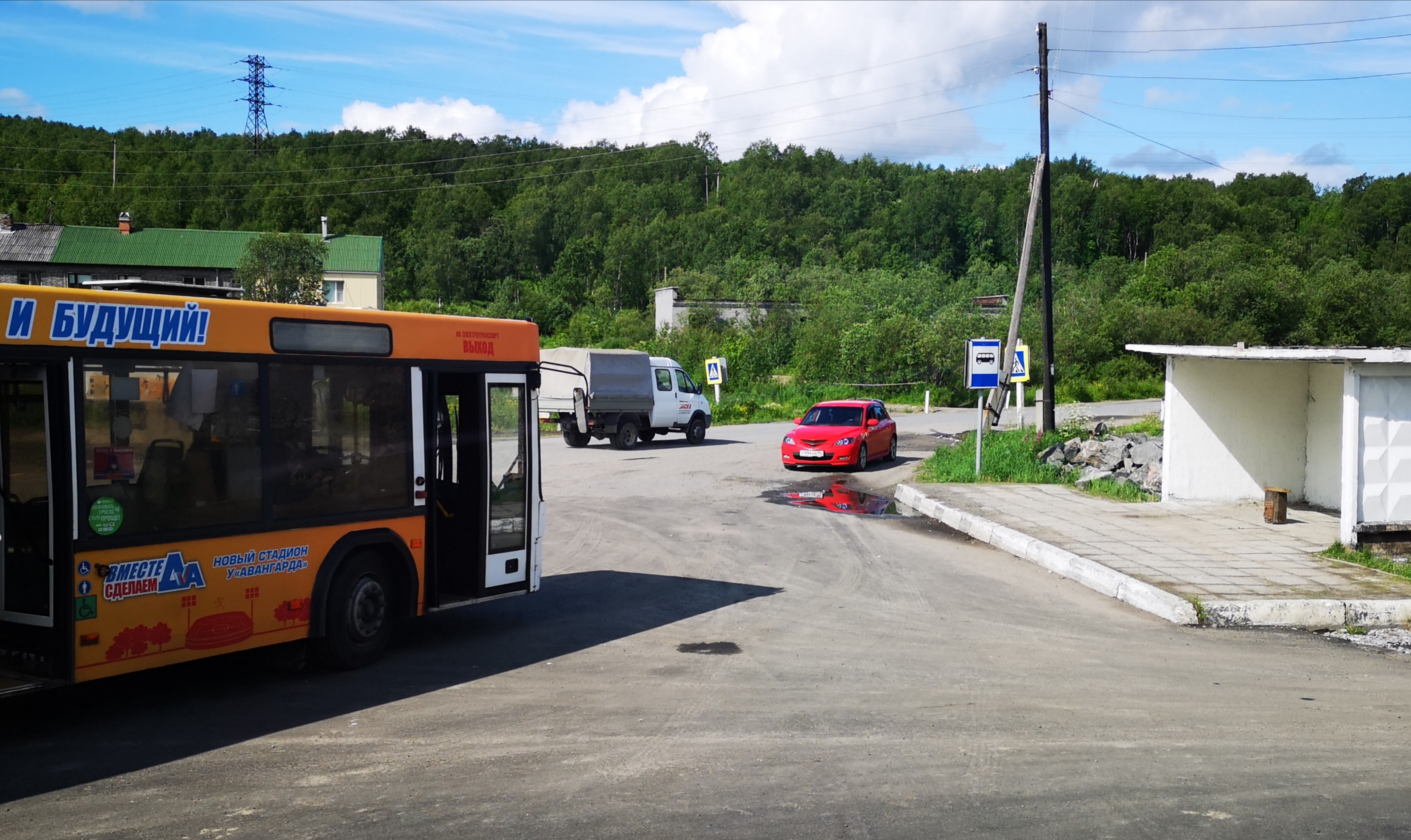 На разворотной площадке перед станцией пассажиров поезда уже ожидают автобусы Мурманского пассажирского автотранспортного предприятия