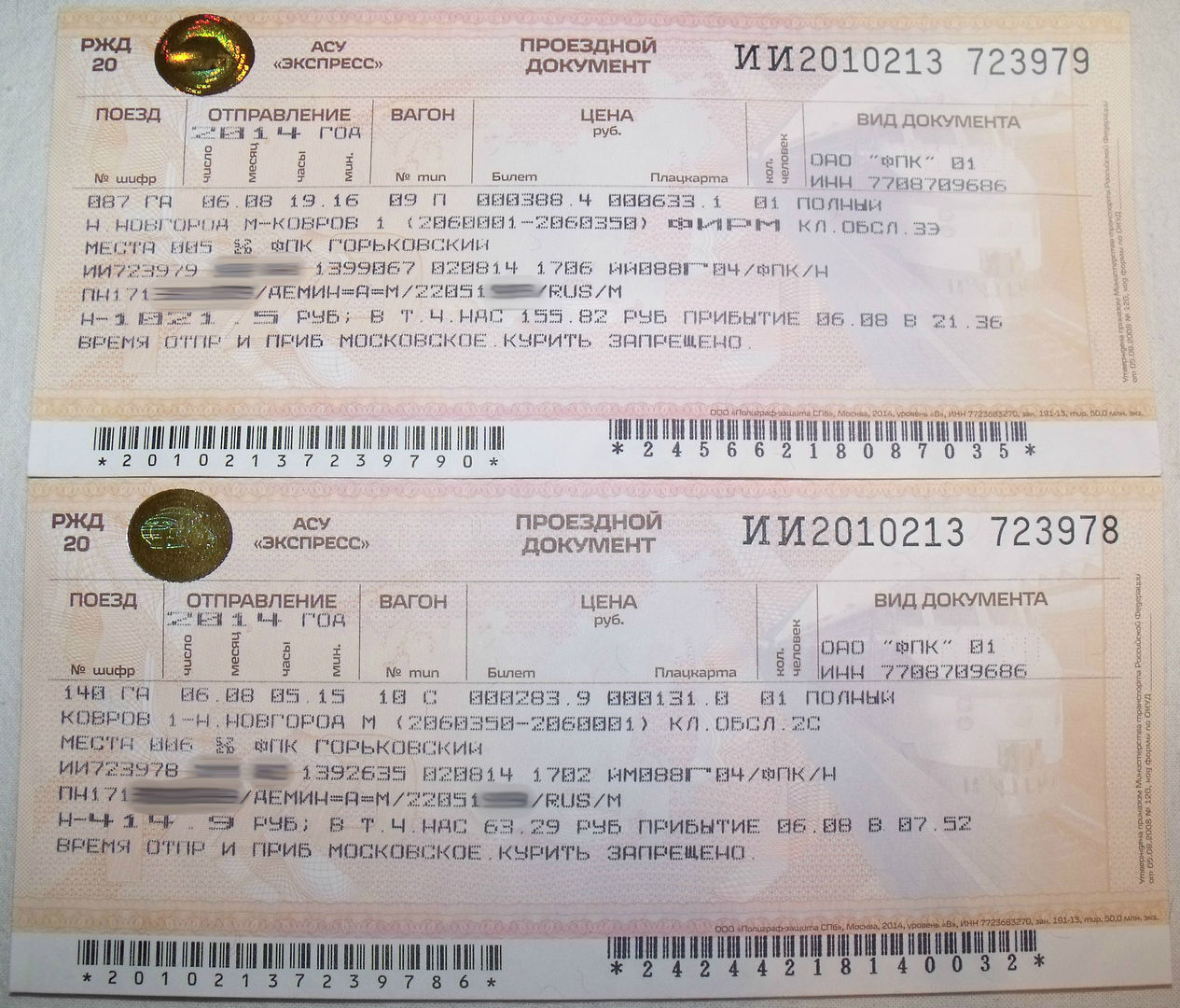 1) Дата поездки 6 августа 2014 отправлением из Нижнего в 19 часов 16 минут, прибытием на станцию Ковров-1 в 21 час 36 минут. Вагон №9 (плацкарт) место 006 (второе купе, верхнее).