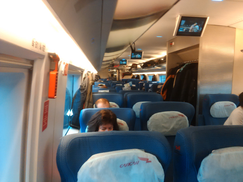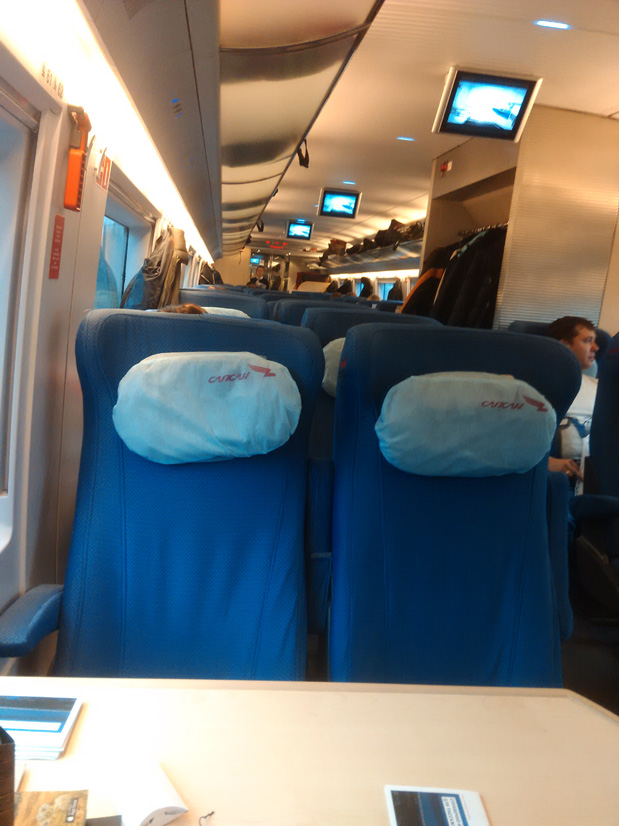 Хорошее первое впечатление. Вообще поезд производит приятное впечатление: табло, экраны, прилагается пресса, наушники, удобные кресла. Думал скорость будет выше, реально же в пределах 100-200 километров в час.