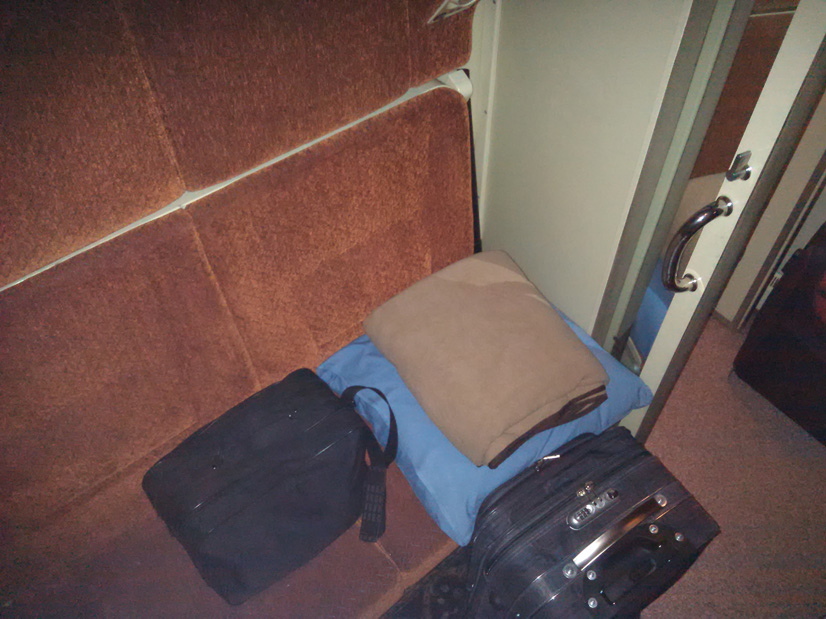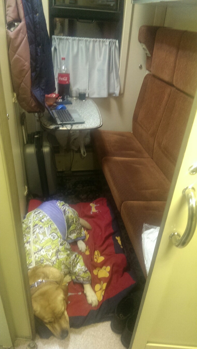 ) особо располагающего к себе отношения.Стол (который по размерам, кстати, вполне достаточен для пользования одним человеком) был накрыт скатертью. Работающая розетка 220 В присутствовала. "Прикроватное" бра работало. На полу лежал коврик, полностью покрывавший собой всю площадь купе. "Плечики" были - в количестве одной штуки, но мне больше и не надо.