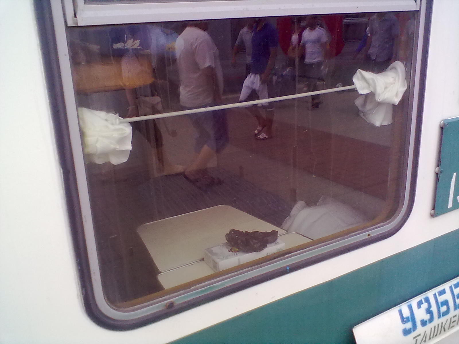 Однако тут меня ждал сюрприз. Купе с моим местом оказалось единственным запертым в вагоне. Когда я, еле расходясь с входящими с сумками другими пассажирами, наконец, добрался до проводника, он сказал, что там они едут, а мне посоветовал присесть в соседнем пустом. Я так и сделал. Однако потом пришел второй, представившийся начальником поезда и велел мне пересаживаться на свое место. Я, конечно, так и сделал. Там на соседнем месте ехала русская бабушка, проживающая в Ташкенте и ездящая в Москву на операцию (к ней, кстати, тот начальник поезда проявил большое уважение, обещая даже по приезду в Ташкент вызвать такси на вокзал). Мы поговорили, однако потом все равно проводник мне велел пересаживаться в другое купе, поближе к нему Я так и сделал, в итоге ехал в одиночестве. Проводник быстро после этого принес белье (обычное белое, но с махровым полотенцем). Только напрягало то, что проводники ночью очень громко разговаривали на узбекском языке, не давая нормально поспать. Утром одна тетка даже вышла из своего купе и также громко потребовала по-узбекски, чтобы они прекратили.
