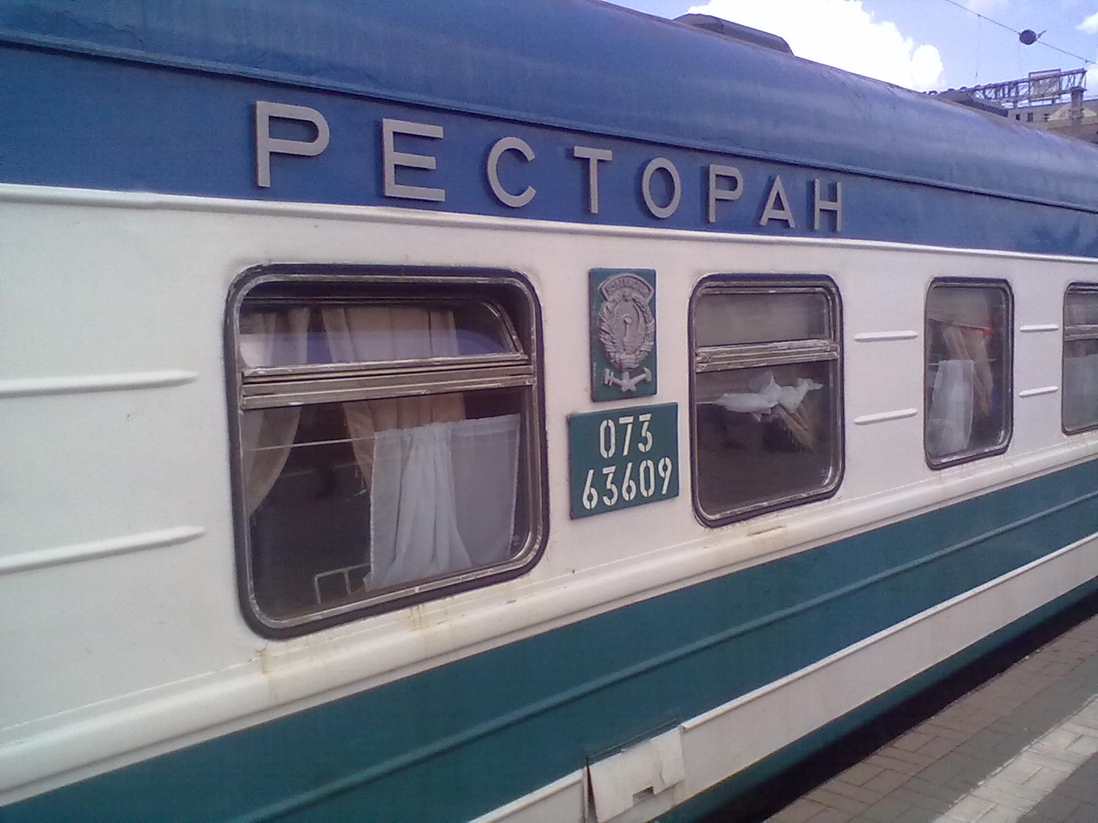 Состав поезда: куча плацкартных вагонов, несколько купейных, 1 СВ и ресторан. Все в фирменных бело-сине-зеленых цветах УТЙ. Из купейных 2 оказались-таки 36-местными, причем один из них был ТВЗ, похожим на середину 2000-х гг.в. и, как мне показалось, был переделан из плацкарта, судя по двум продольным палкам в верхней части окон. Второй 36-местный - отремонтированный аммендорф на Ташкентском ВРЗ с пластиком, как в плацкарте. Плацкартные - все (в т.ч. и мой) после ремонта на Ташкентском ВРЗ с овальными окнами в дверях, напоминающими наутилусы и коричневым пластиком внутри а-ля аммендорф (правда, один из них был все-таки белым внутри). Во всех вагонах белые занавески, а в СВ и ресторане к ним еще добавляются огромные золотистые шторы. В ресторан не ходил по причине его слишком большой удаленности от моего вагона и малым временем в пути.