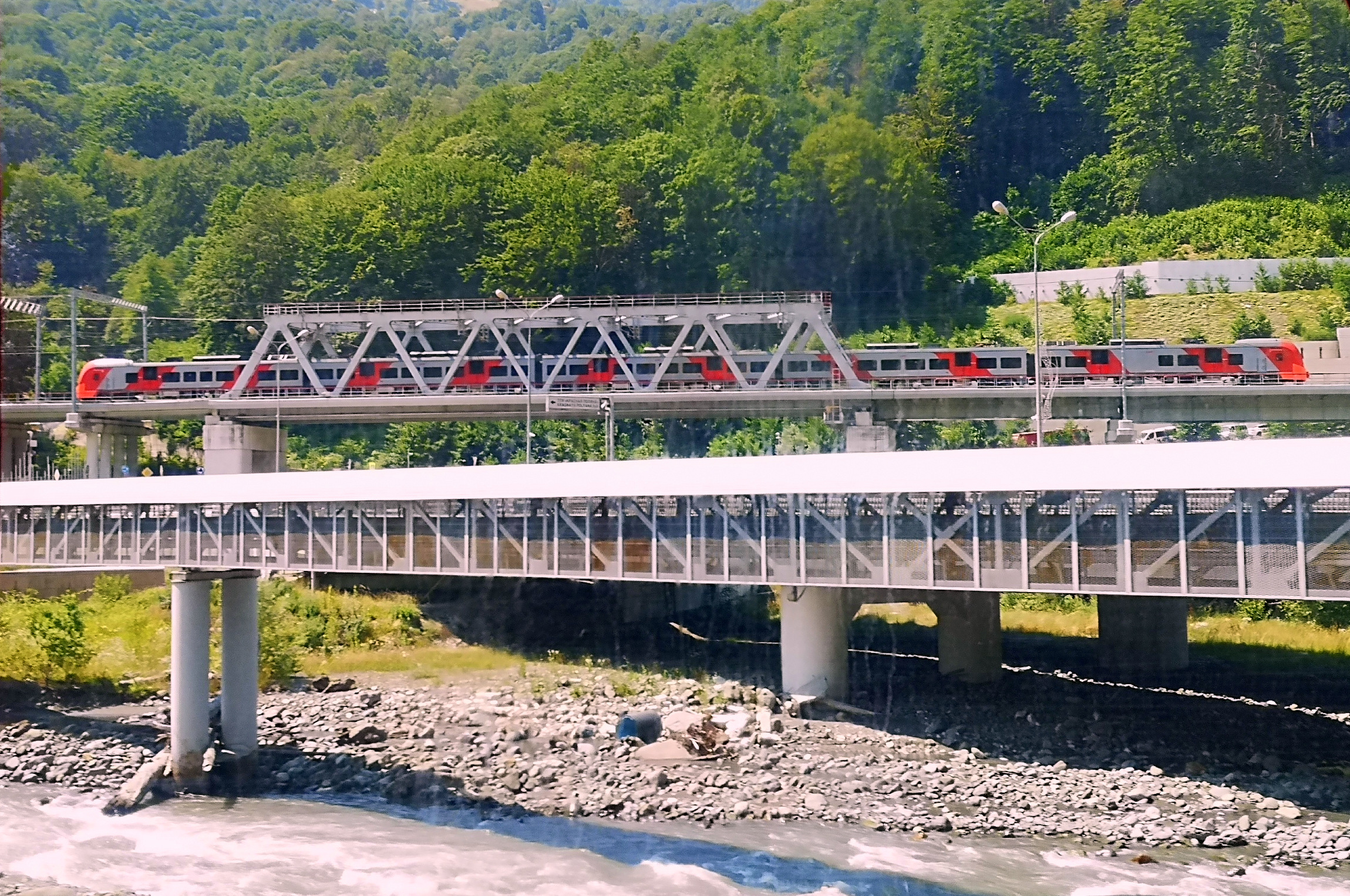 По Кривенковской нас пропускала утренняя электричка Туапсе — Горячий Ключ. Со склонов гор красиво каскадами спускались ручьи воды после дождя. В районе разъезда Греческий проследовала встречная ласточка Адлер — Краснодар №802.