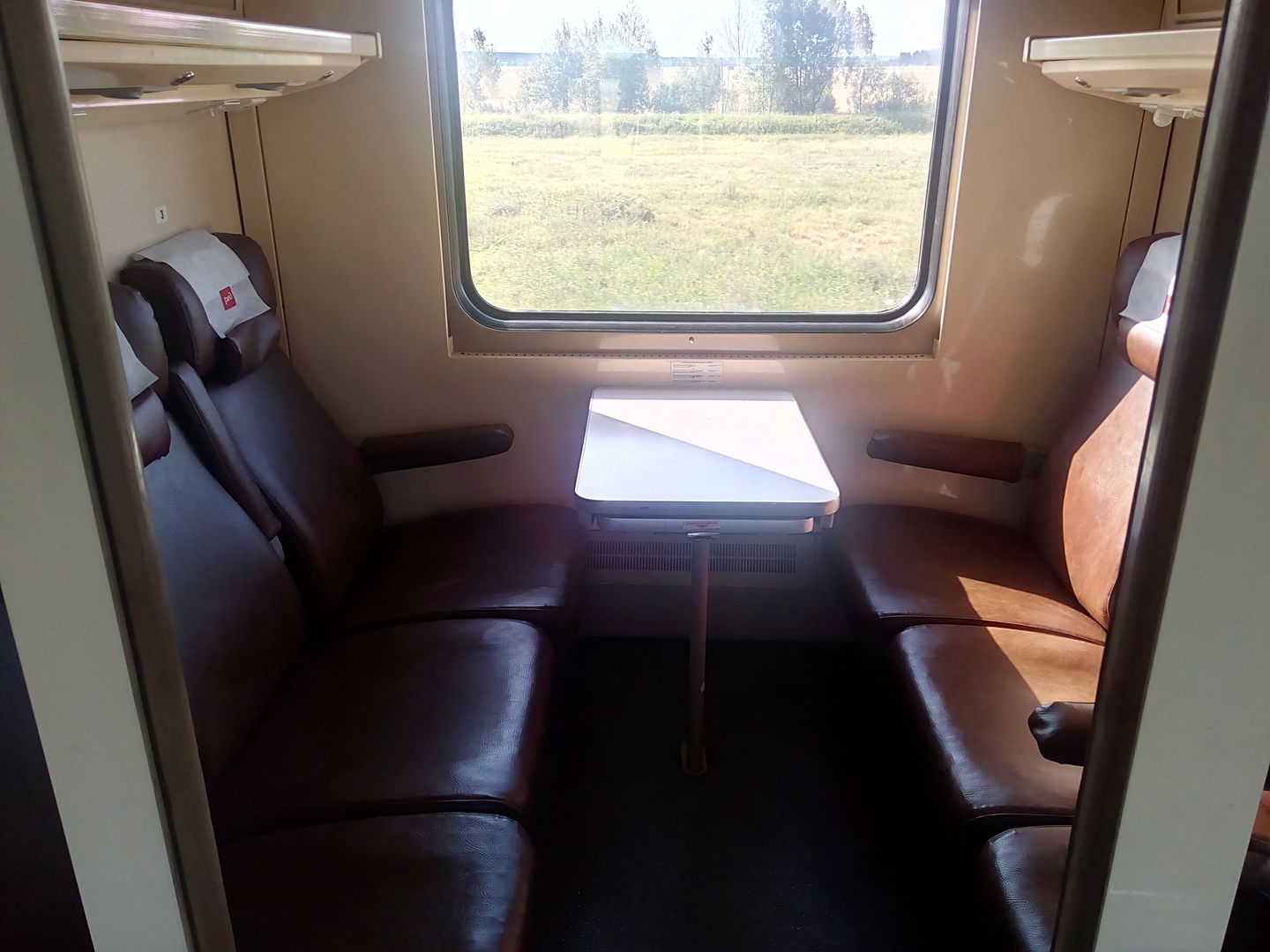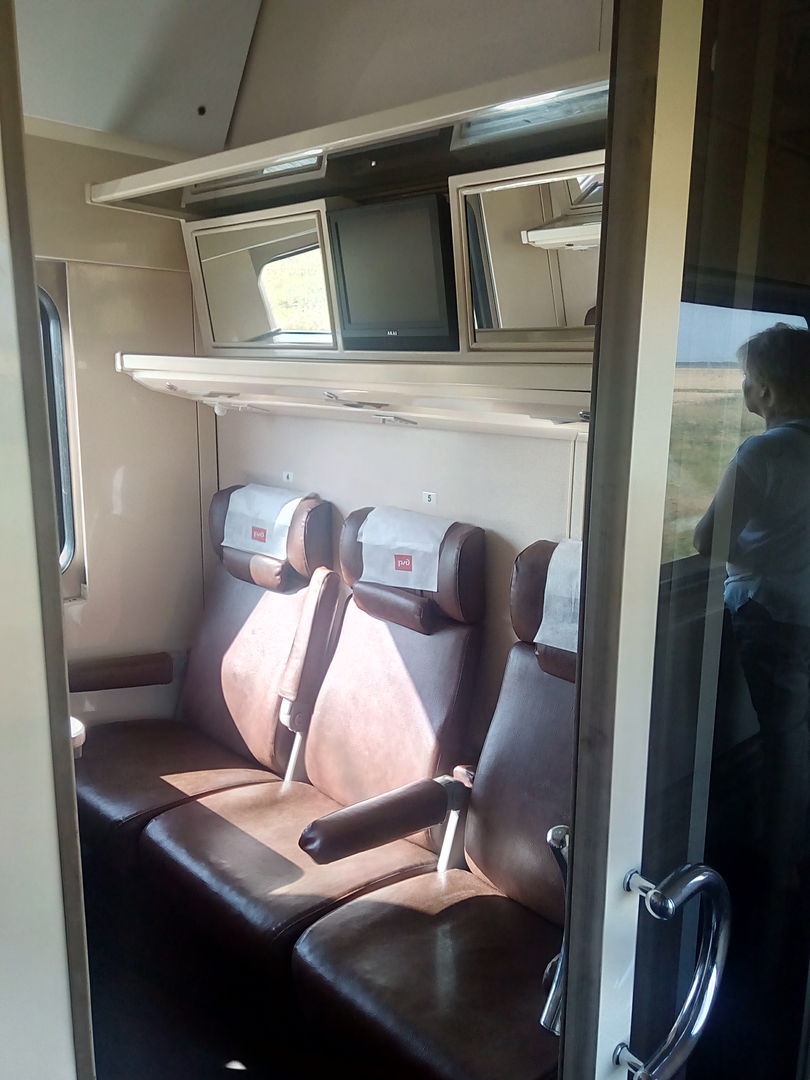 О вагонах. Компоновка вагонов, как у купейных. В каждом купе по 6 мест. Количество купе не 9, а 8, поэтому они пошире. В купе есть столик, можно по-человечески перекусить. Если устал сидеть, можно выйти погулять в коридор. У меня было опасение, что сидеть напротив друг друга не очень удобно, но оно не оправдалось. Купе широкие, и с этим проблем нет. Очень много места для багажа - и под сидениями, и над сидениями, и над коридором (как в обычных купейных вагонах). Когда дверь в купе закрыта, внутри очень тихо и уютно, это плюс по сравнению с классическими сидячими вагонами, в которых общий салон. Дребезга, как в новых сидячих вагонах ТВЗ, нету, эти вагоны намного более тихие. У проводника можно взять стакан в подстаканнике, а также приобрести чайную продукцию. Привычного титана нету, кипяток в кулере в купе проводника.