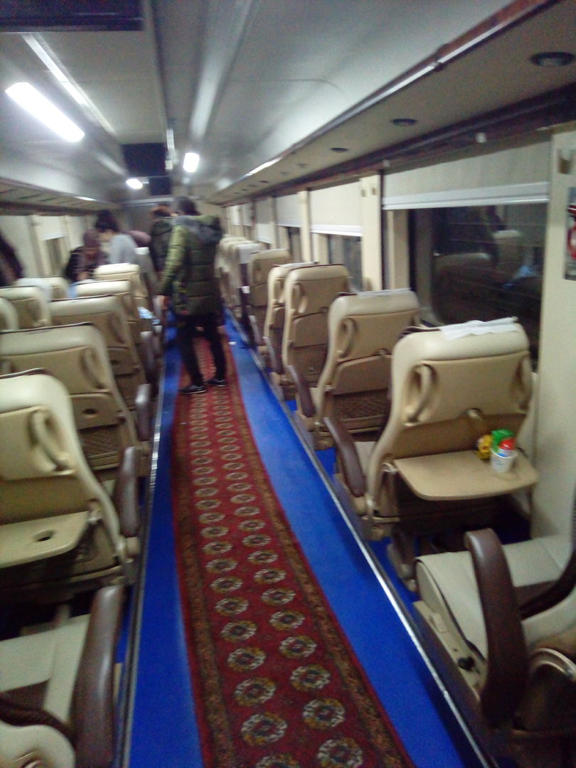 4 января 2019 года, Самарканд - Ташкент Южный. Вагон 12С, место 5. Стоимость 537 рублей, в этот раз чай не разносили. Вагон очень комфортный, сиденья из кожзама, стены обиты в вагоне тоже кожзамом. Сидения расположены по типу 2+1. Те же двери, как в электричках. Чисто, тепло. Оценка 10.
