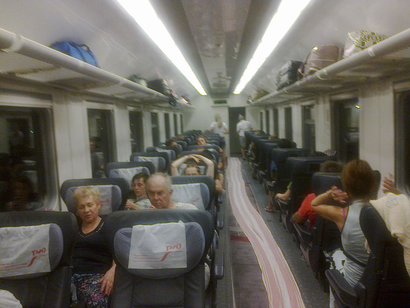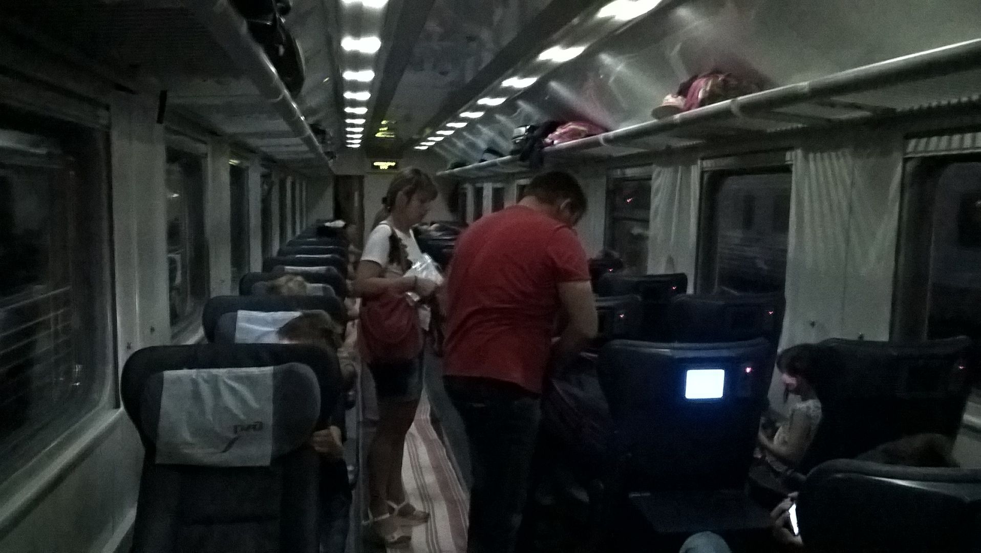 Минусы: сидения работали только в 2 положениях. Максимально сидя и полулежа. Причем до конца они не опускались (столько свободного пространства, можно было инженерам и задуматься над этим). Далее, раздражал яркий свет. Не знаю, есть ли в таких вагонах тусклый "ночной свет", но обычных 2х режимов ("ярко" и "не очень ярко") явно не хватает. Сзади сидели 2 мальчика, которые как проснулись к 5 утра, так и стали между собой разговаривать. Пытались шепотом, но все равно получалось громко. Ни мои слова, ни слова родителей тут не помогли. Разбудили пол вагона, в общем. К 6 утра (Туапсе) проснулся весь вагон, и практически никто уже не спал.