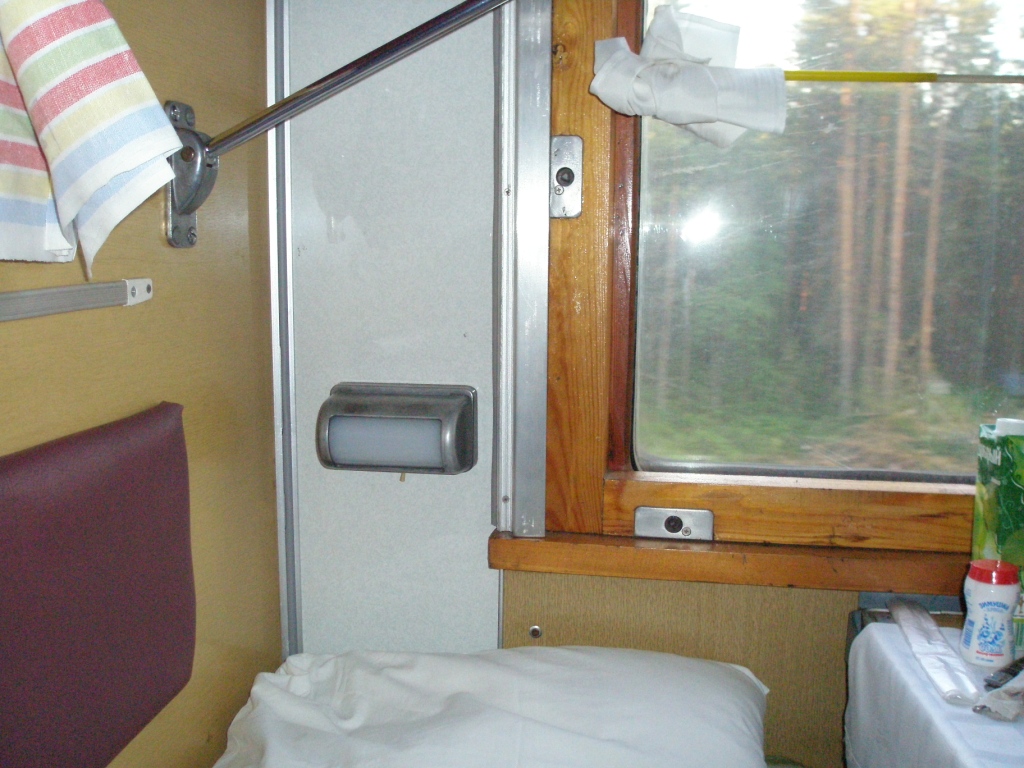 3) Первое впечатление негативное. При посадке в вагоне было душно и царил полумрак, т.к. лампы до середины коридора не горели, а во второй половине горели лишь на треть мощности. Впрочем, когда тронулись - дышать стало полегче, вентиляция тут все-таки работала, уже хорошо. Время было позднее, ложусь спать, но тут еще сюрприз: на каждой неровности железной дороги вагон требовал кап.ремонта в виде скрипящей межкупейной перегородки и стука в районе окна. Оно и понятно, насколько я смог разглядеть шильдик, этот немец 86-го г.в.