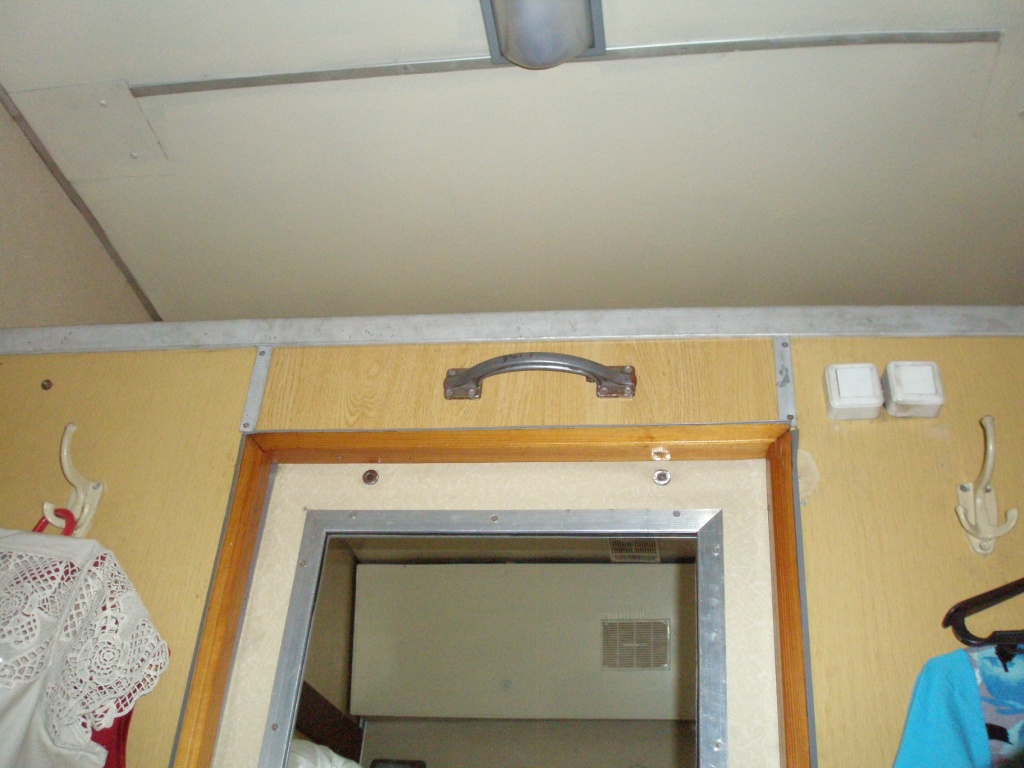 3) Первые впечатления – внутри вагон старый. Есть мягкие спинки для удобства сидения. Внутри вагона жарко. В проходе и в купе лежит ковровая дорожка. В окнах – деревянные рамы. Кондицио-нера нет. Титан работает. Вагон не оборудован табло с индикатором занятости туалета.