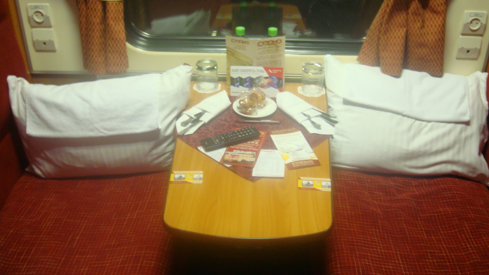 При входе в вагон нас встречали два проводника: мужчина лет 35 и приятная девушка около 30 лет - бегло проверили паспорта, вежливо пригласили в вагон и указали нам наши места. Затем мужчина продолжил стоять у дверей вагона, а девушка проводила нас до купе, примерно через две минуты она пришла к нам и рассказала нам про поезд в общем, про вагон в частности, как пользоваться туалетами и прочими наворотами, а также приняла заказ на завтрак.