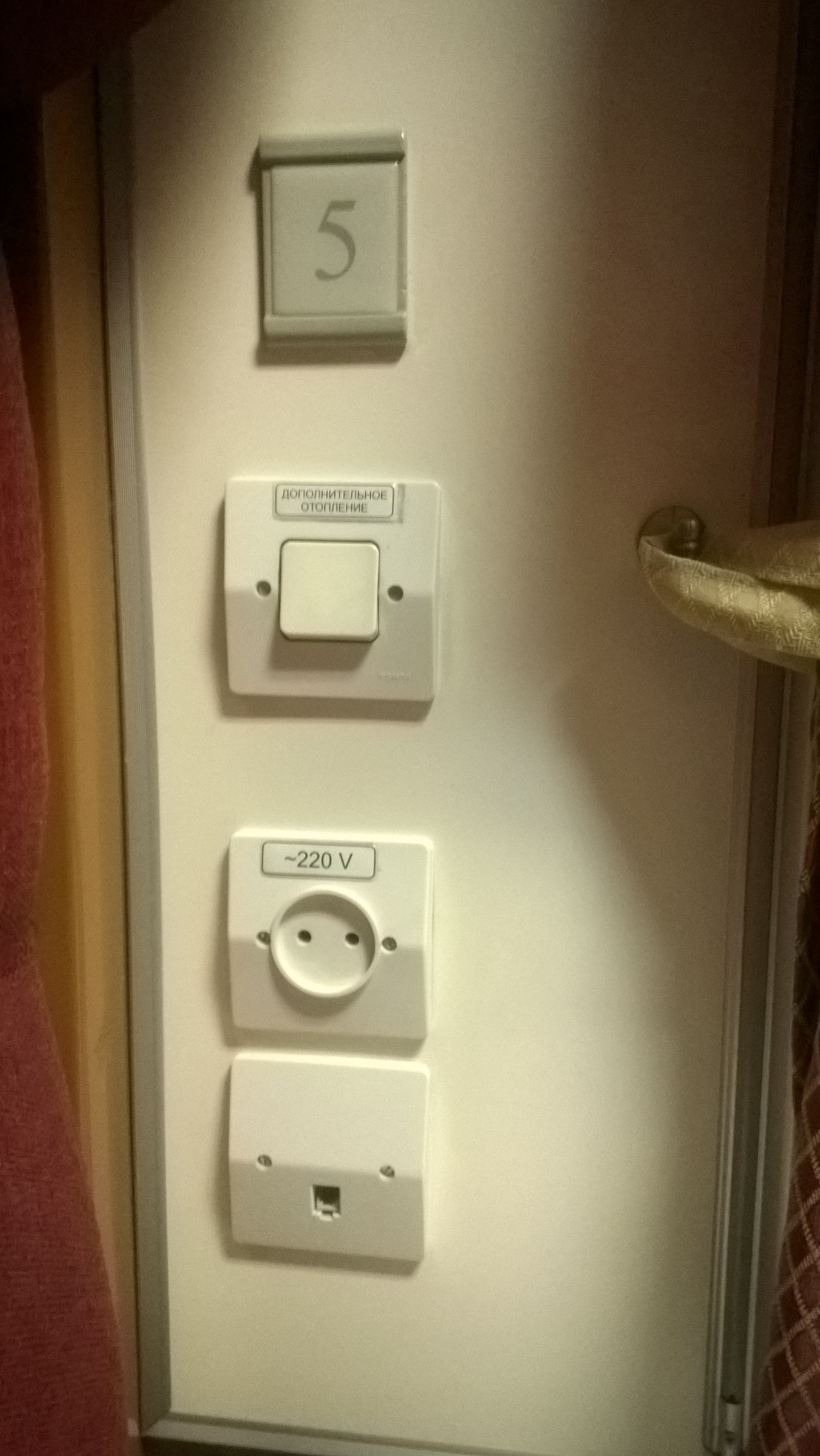 прибамбасы, которые действительно присутствуют в купе и работают исправно. Розеток по одной на каждого пассажира. Кнопки регулирования кондиционера и отопления находятся у разных пассажиров, это, наверное, не самое удобное решение, однако не критично.