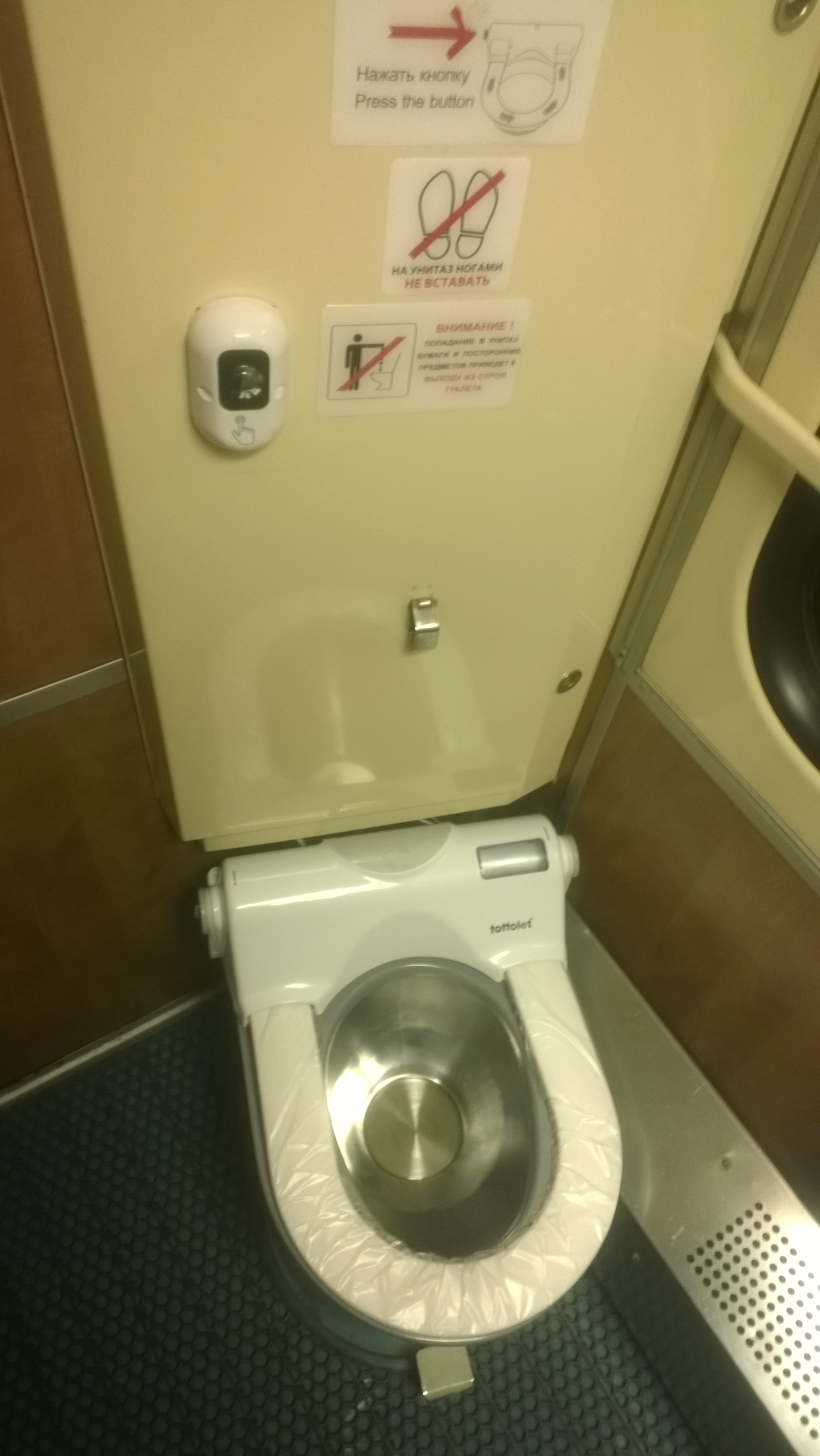 На стульчак одета полиэтиленовая плёнка, которая используется вместо одноразовых накладок в фирменных поездах ФПК, и при желании её можно поменять, нажав на кнопку. Всё работает. :*THUMBS UP*: Еще одна приятность в поезде.
