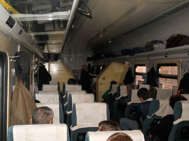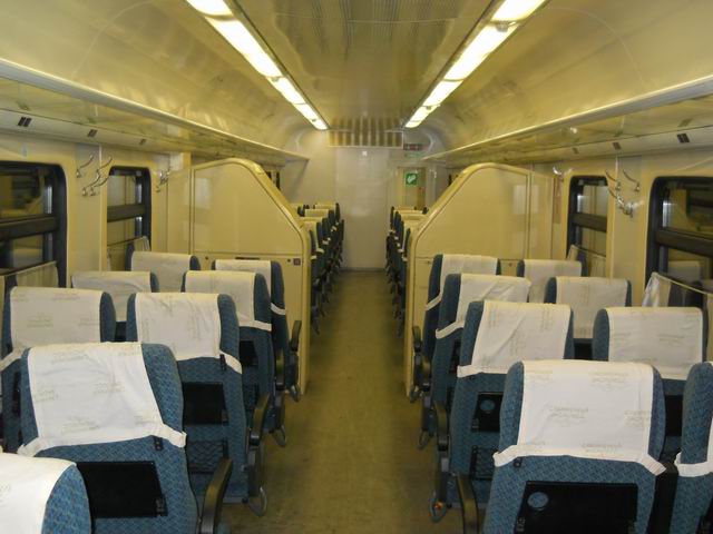 8. Кресла в вагоне удобные, шаг кресел широкий, сидеть удобно, при желании можно свободно вытянуть ноги. Все кресла расположены по схеме 2+2, лицом к середине вагона, часть мест "слепые". В общем, комфорт практически ничем не хуже, чем в Сапсане. Только откидные столики хиленькие, плохо фиксируются в откинутом положении, стаканы в подстаканниках перевешивают.