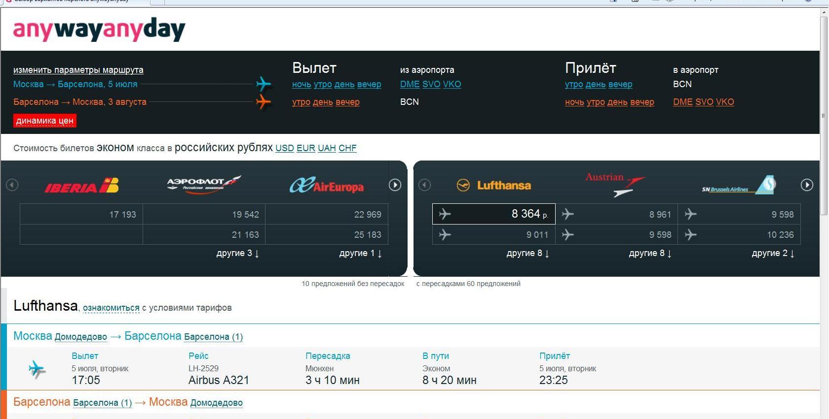 Цена авиабилета Москва-Барселона-Москва (даты первые попавшиеся: 05 июля - 03 августа)