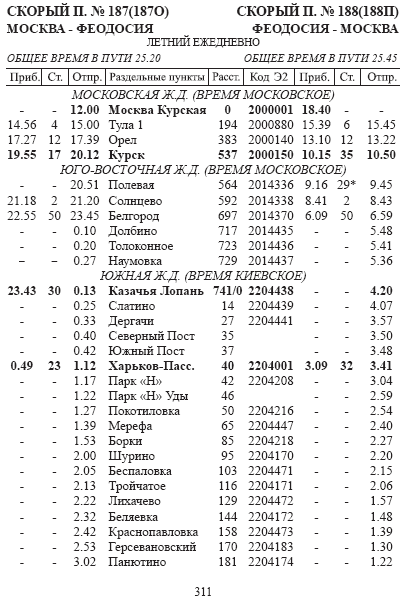 Служебное расписание поезда 187М/188П Москва - Феодосия на новый график 2012 - 2013 гг.