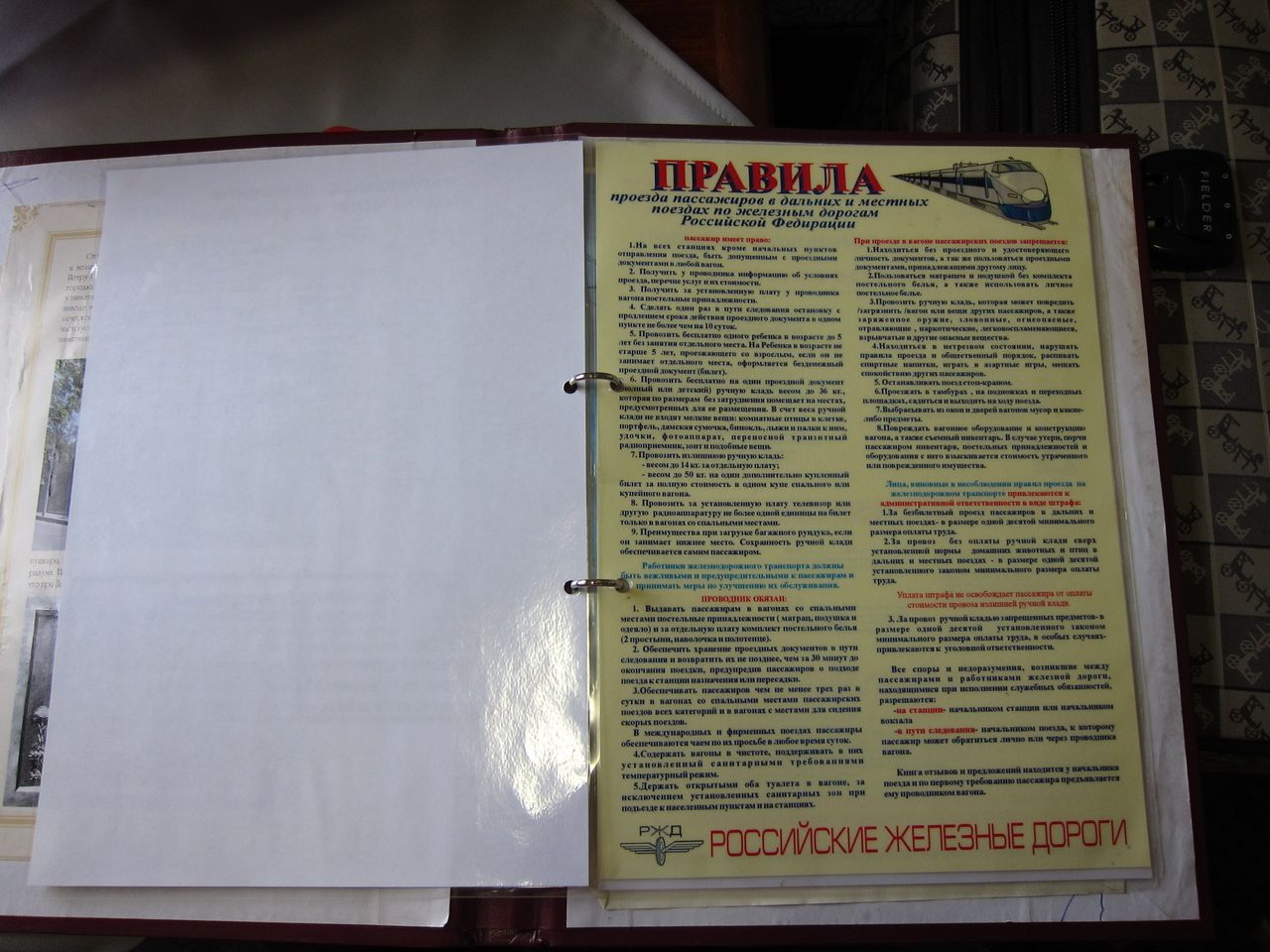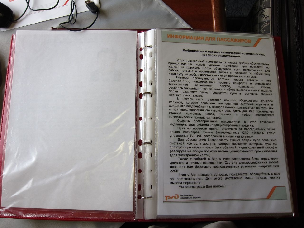 Телеграфирую из Рязани. Фотографии содержимого информационных папок вагона 22, класс обслуживания 1А.