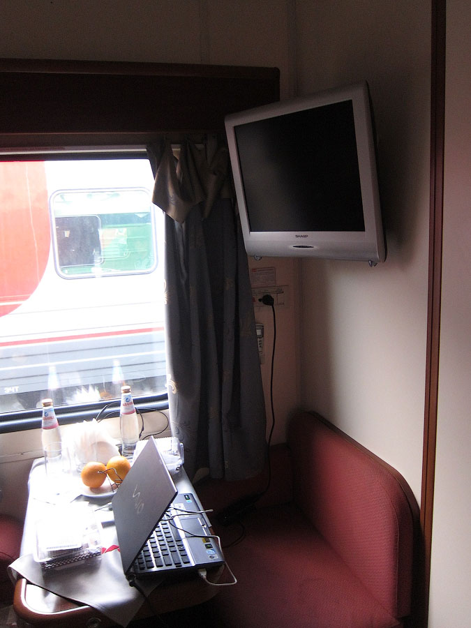 Подошло время чайной паузы. Проводница приносит чайник и две чашки с блюдцами, на чайнике гравировка "Москва - Казань" и герб республики Татарстан.