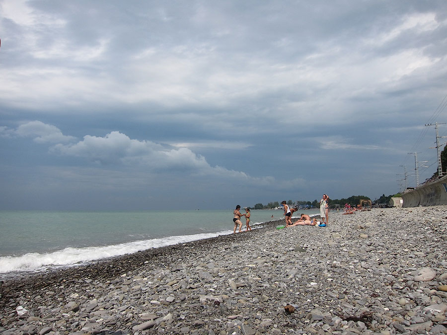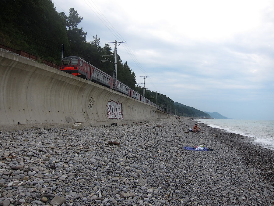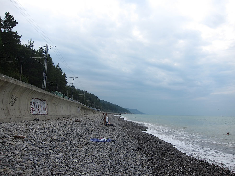 По границе - всего-то 40 минут на нашей стороне, но с учетом того, что нас везли от и до, часть очереди, разумеется, изящно обогнули ::-): Море после границы сразу изменилось - и спокойнее, и цвет совершенно другой, никаких коричневых вкраплений у берега нет. Очень четко стали резать засвет сотовых сетей - сразу после границы ничего российского ловиться не захотело. Так что в итоге повторяю вновь разницу во времени добирания: сухумский вокзал пролетели в 14:40, то есть от Казанского до Сухумского 28,5 часов. Обратно, говорят, уже ж., а ближе к 1 сентября что будет...