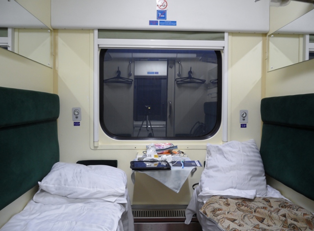 Оценка - честно говоря 6 баллов. За такую цену такой интерьер как то не впечатлил - лучше брать купе. Две койки удобны разве что если собираешься ехать на едине с другим человеком и не хочешь случайных попутчиков. Уюта как такового не было, диван показался узковатым. Поезд к тому же летел довольно быстро - заполнять миграционку на ходу было весьма "весело" - почер как у куриы лапой вышел. Ночью на такой скорости не уснуть - вагон прыгает и скачет - качает не хило, всю ночь что то гудело - может кондиционер? Как советский олодильник марки ЗИЛ. Одеяла самые обычны - ничего не было заправленно. Впрочем в плюс - вежливость проводника, чай-кофе предлагали. Впрочем за такую цену билета ( примерно чуть более 8000 руб. ) могли бы чай сделать бесплатным - ИМХО. Окончательный вердикт - дорого за то, что не стоит таких денег. Впрочем как понимаю поезд из Киева до Москвы другой и более уютный. Еще как понимаю разница украинские и российские вагоны - потому наверно надо попробовать попасть на российский вагон, но лично я лучше возьму купе на этот поезд.