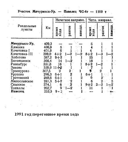 Перегонное время хода по участку Павелец-Мичуринск ЮВЖД 1991 год