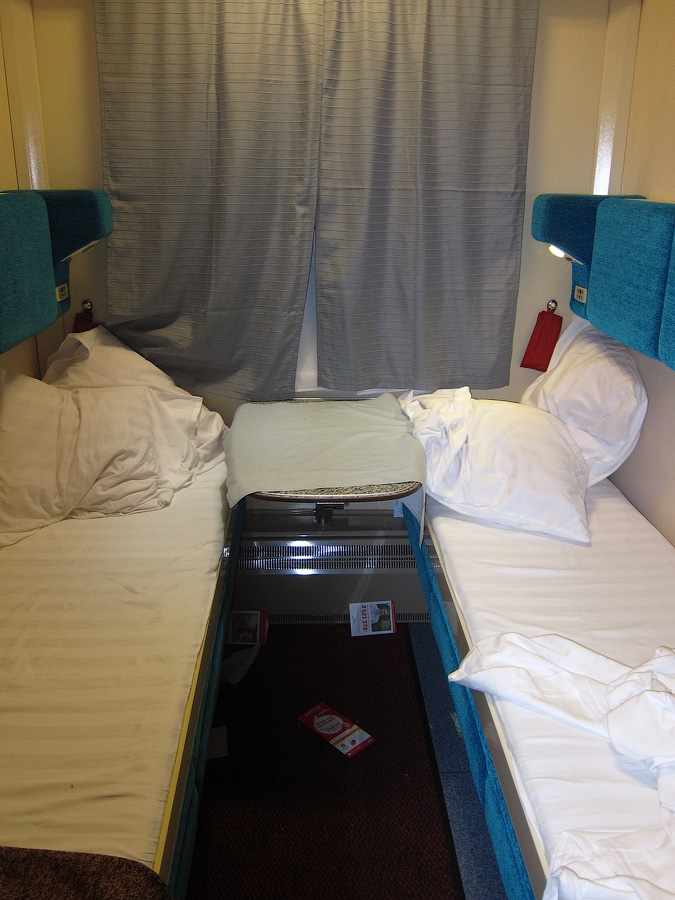 Купейный вагон №9 оказался свеженьким тверским трансформером 2007 года рождения с коричневой обивкой диванчиков. В одноместном купе уныло встретила лишь реклама приснопамятной лотереи: