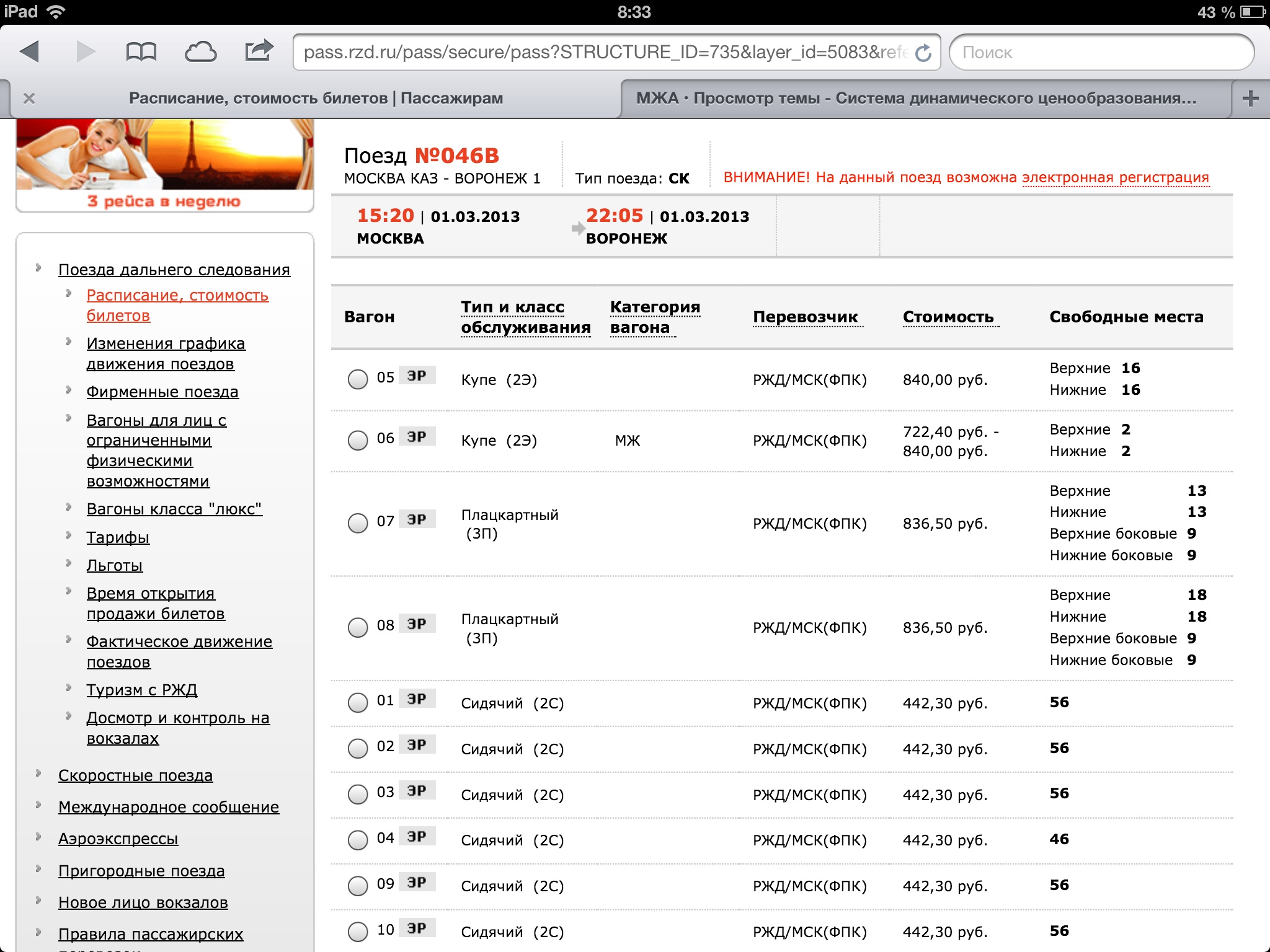 Открыта продажа билетов на поезда ОАО "ФПК" (дочернее общество ОАО "РЖД"), стоимость проезда в которых сформирована с применением системы динамического ценообразования.