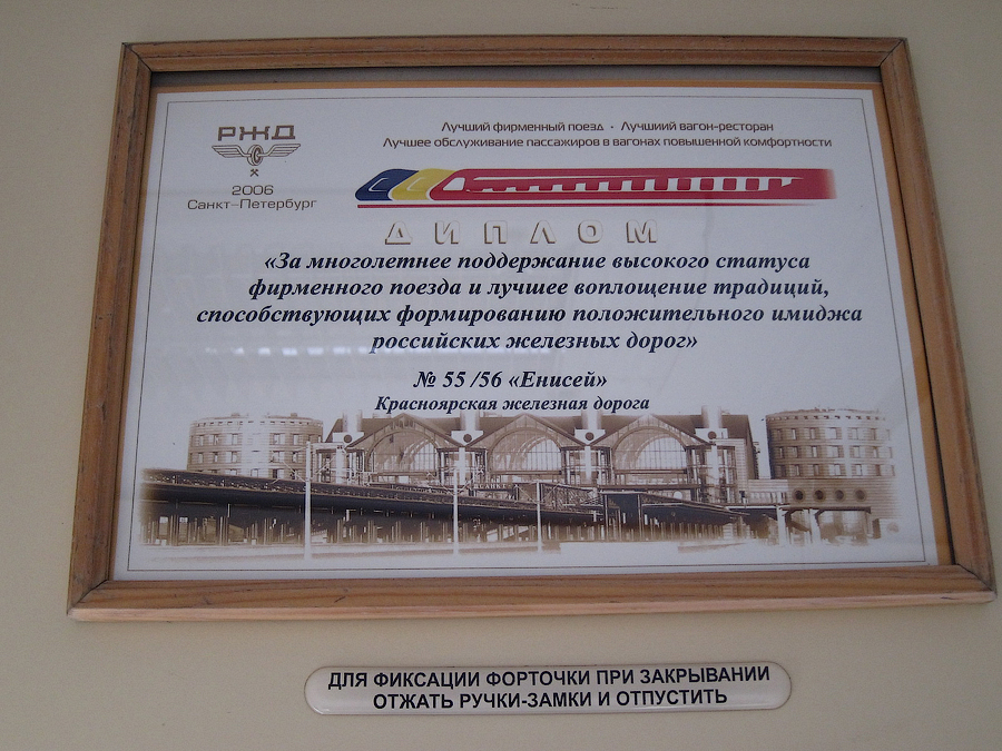 В целом поезда оставила отличные впечатления: оценка 10+ из 10. Бригада "Енисейского" филиала в части обслуживания в вагоне СВ оставила лучшие впечатлении среди всех виденных бригад в фирменных поездах на восток (а сталкивался со многими бригадами "России", "Сибиряка", "Томича"). Думаю, что и диплом, висевший в косом коридире вагона у титана, был получен не просто так, хоть и времени с того момента прошло уже прилично:
