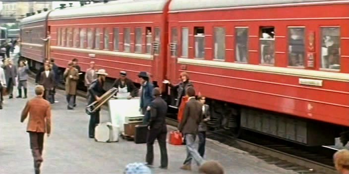 Далее лёгким лёгким движением монтажиста отъезжающий от свердловского вокзала состав вообще трансформируется в московскую электричку Октябрьской ЖД. Почему на морде нет положенного советского герба?