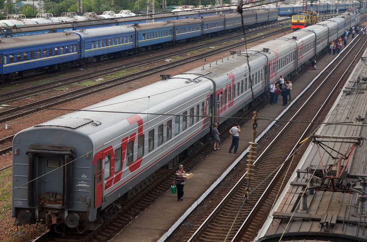 Поезд во время одной из последних своих стоянок по Сухиничам (международные вагоны последние, пидовские купе и РЖДшный плацкарт посерединке, УЗ ближе к локомотиву) + вагон-буфет международной группы. Текст будет завтра :)