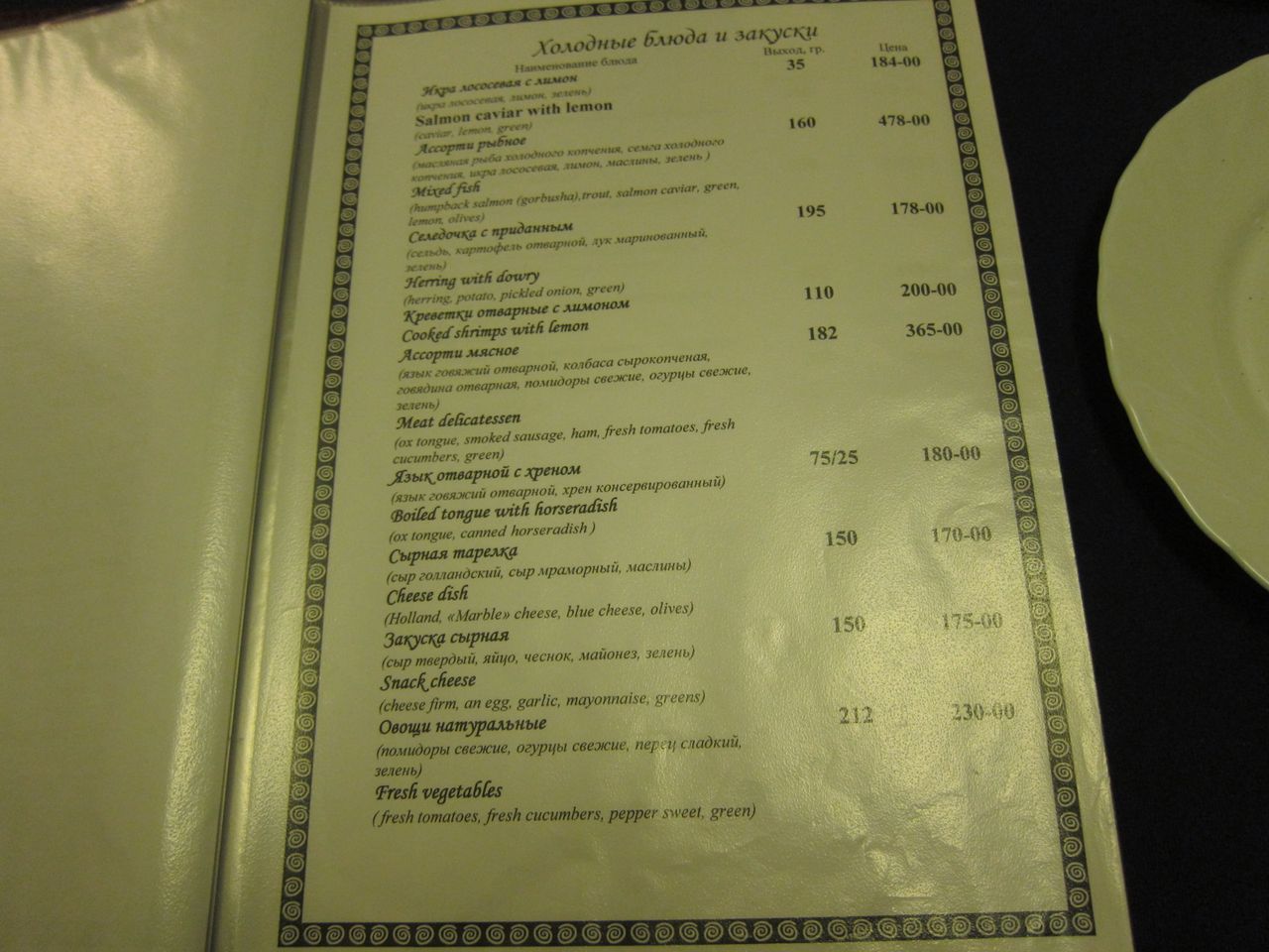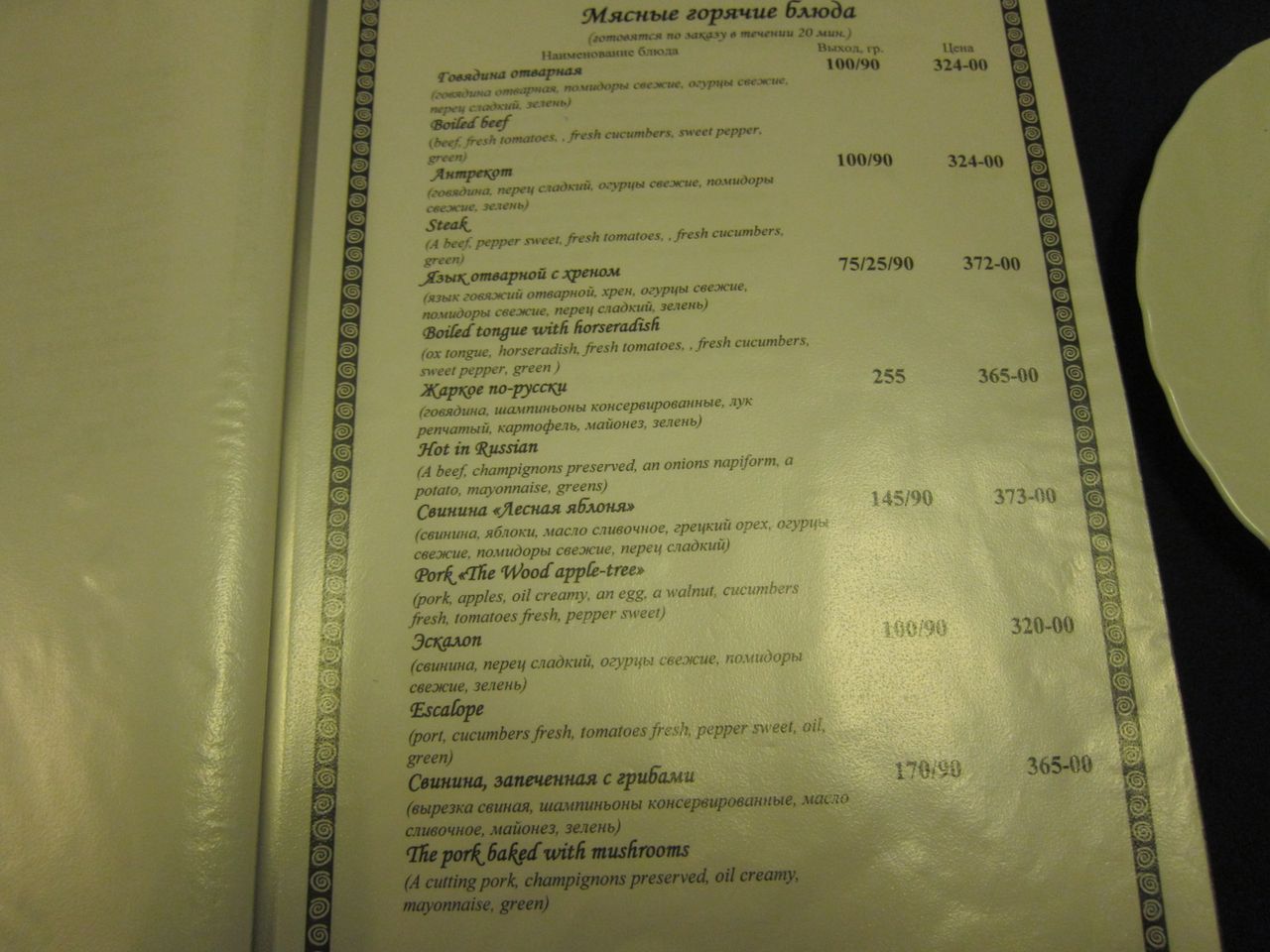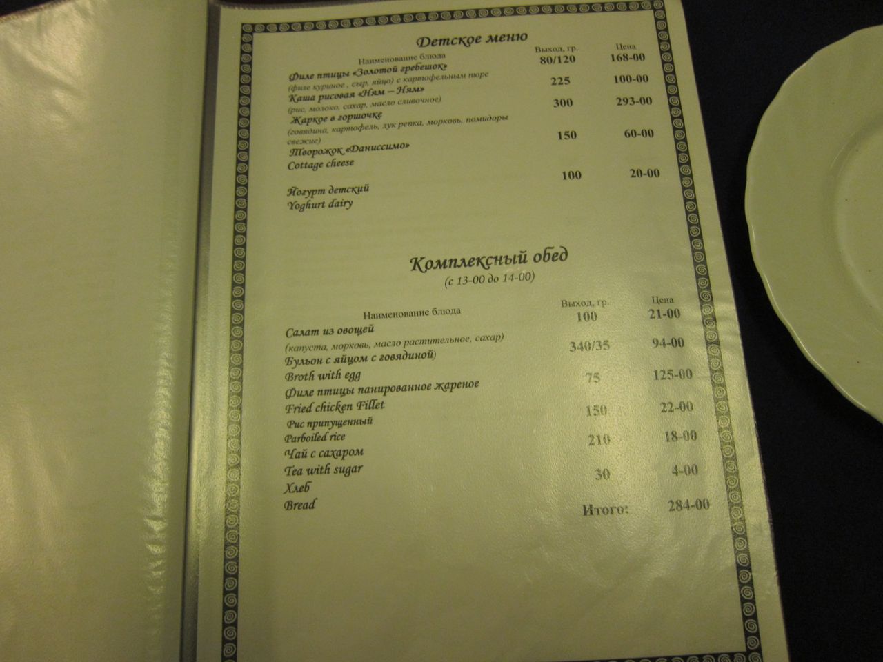 Меню ресторана, время работы с 09:00 до 23:00 по местному времени. Что характерно, напрочь отсутствует крепкий алкоголь, в наличии только пиво. Хотя это мимо меня в любом случае, просто видел разочарованные мужские лица, пришедшие тяпнуть водочки.
