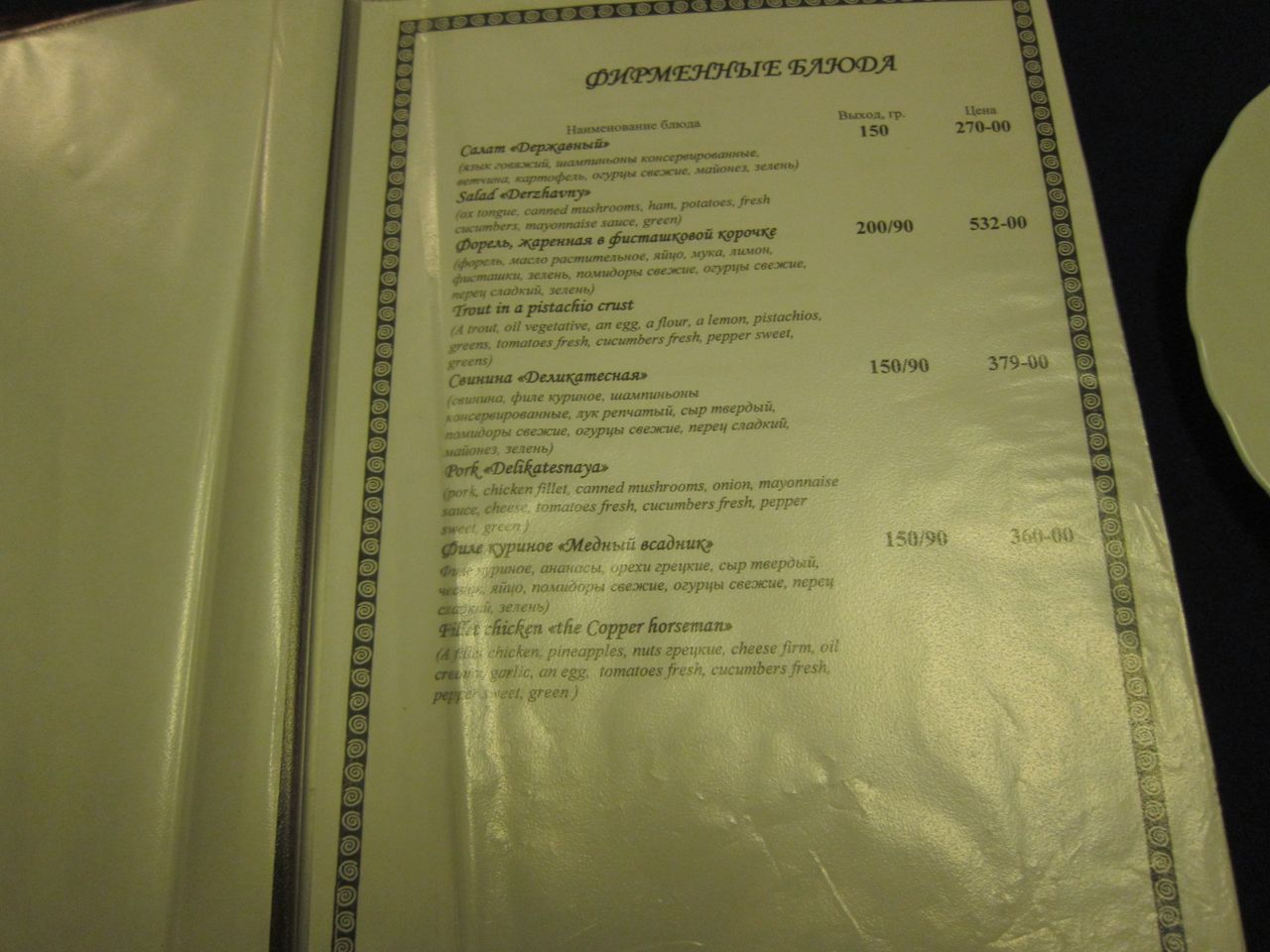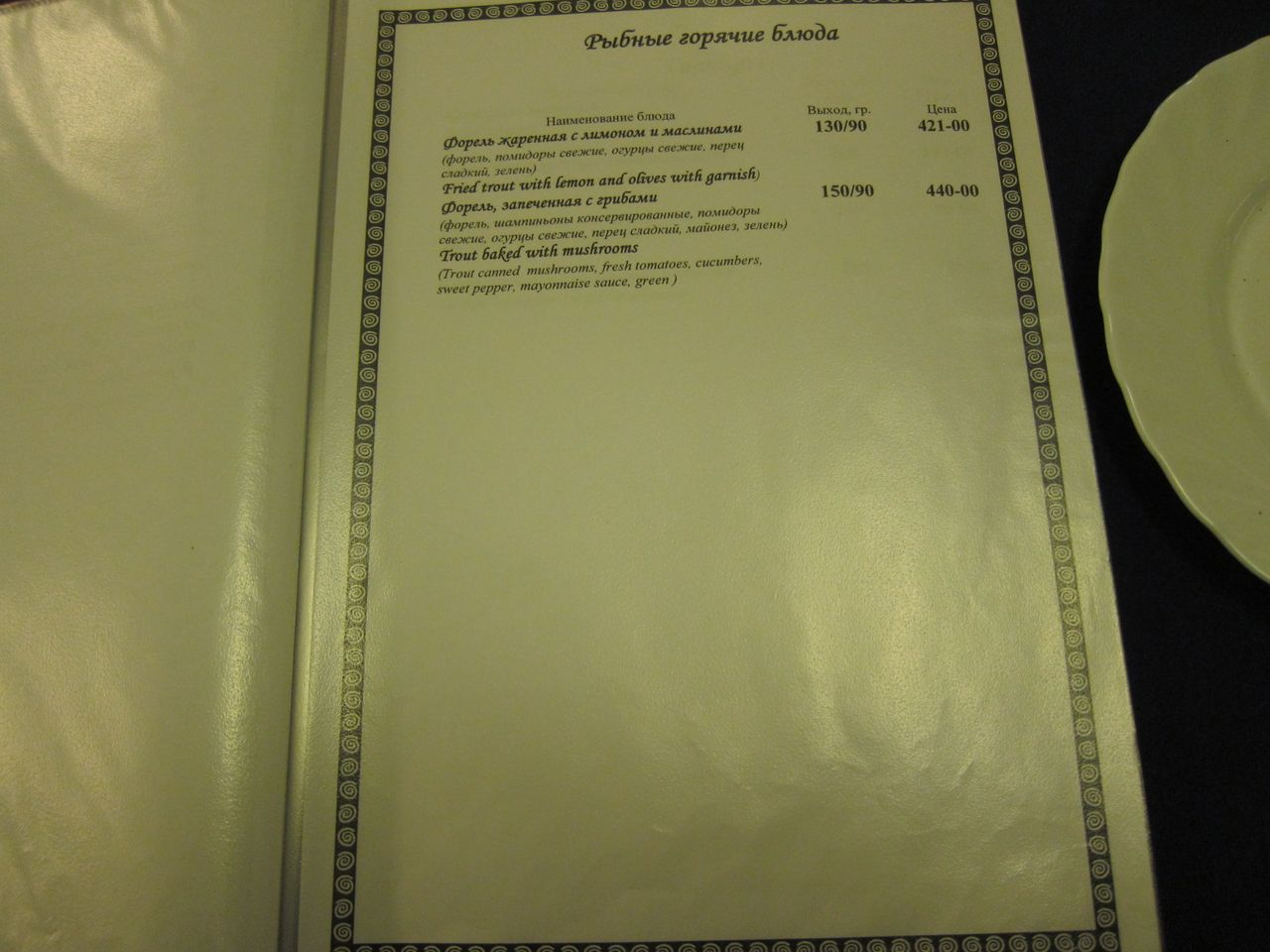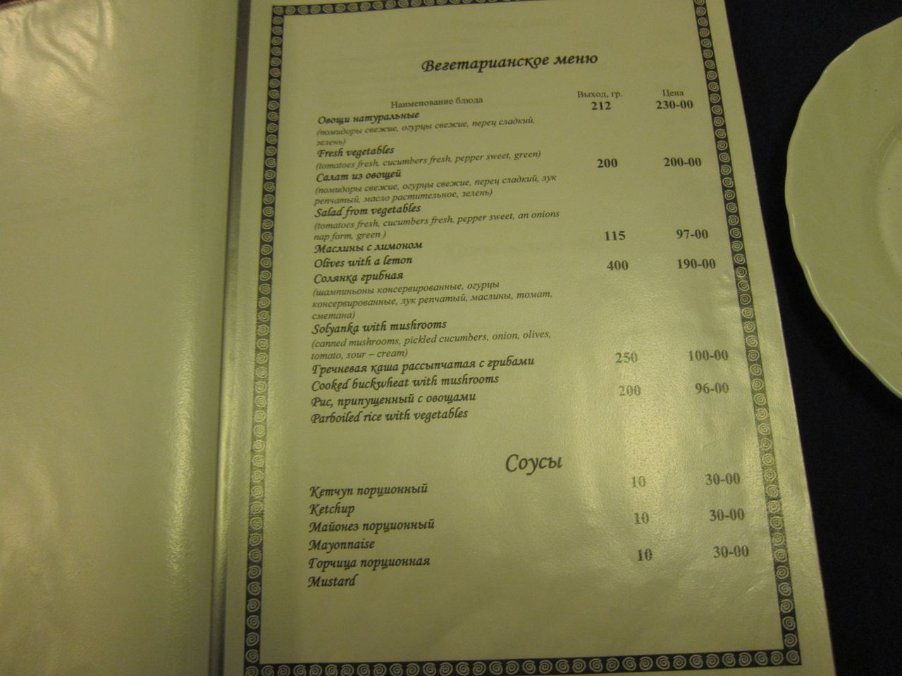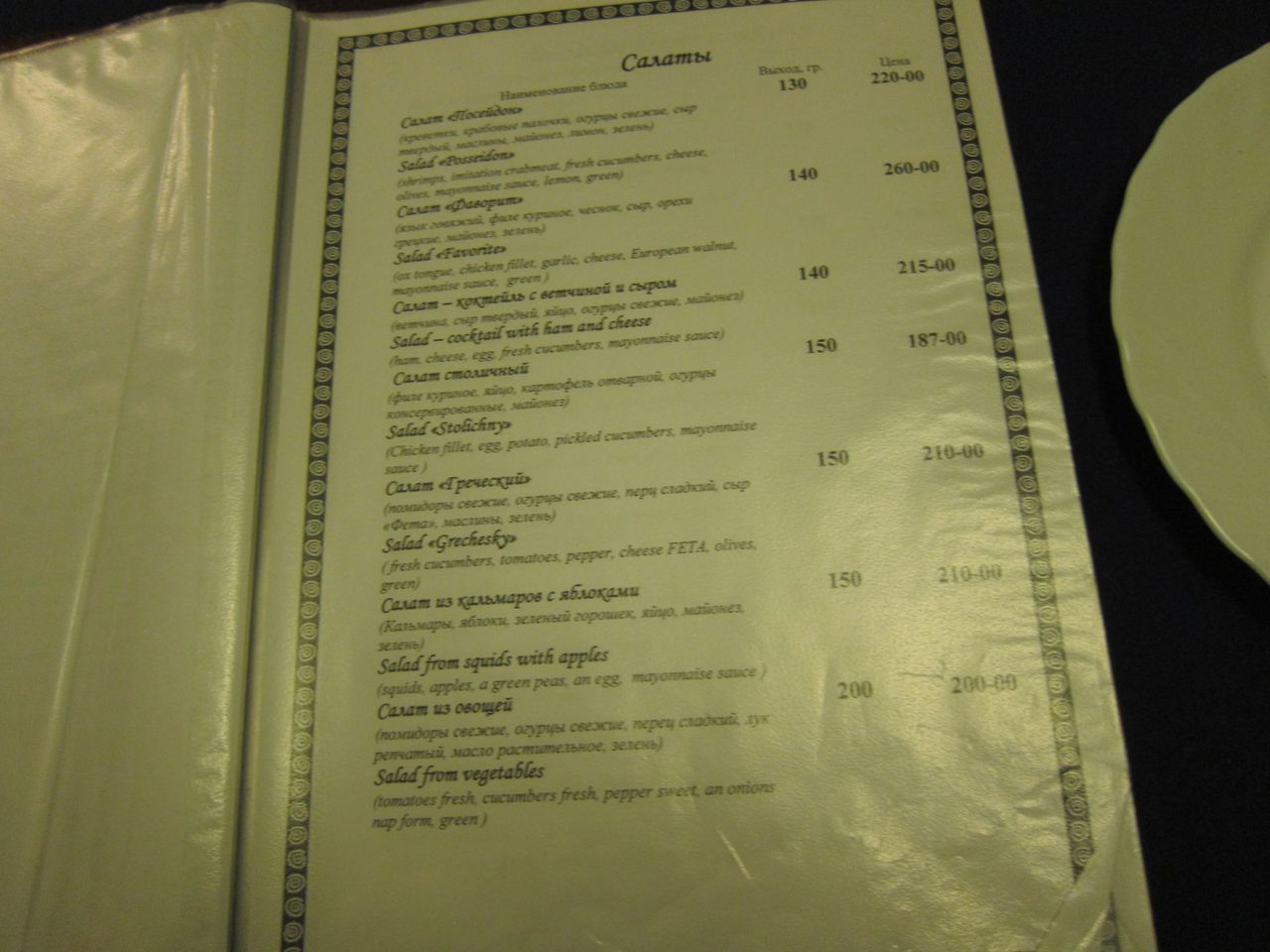 Меню ресторана, время работы с 09:00 до 23:00 по местному времени. Что характерно, напрочь отсутствует крепкий алкоголь, в наличии только пиво. Хотя это мимо меня в любом случае, просто видел разочарованные мужские лица, пришедшие тяпнуть водочки.