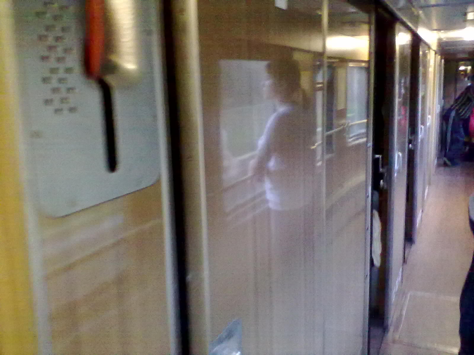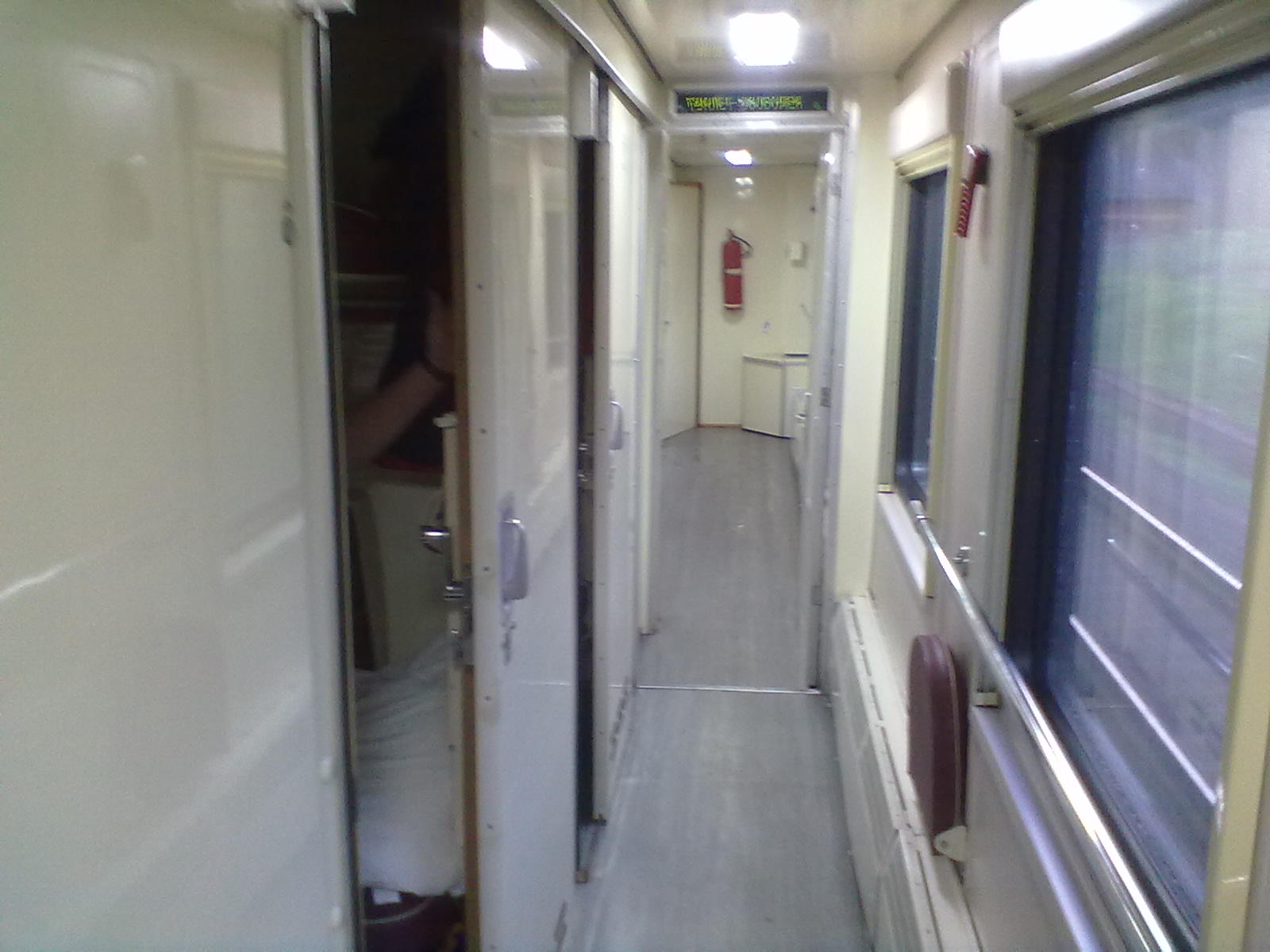 Вот, как выглядит этот Аммендорф. На нём установлен кондиционер (решётка воздухозаборника, как у белых ТВЗ), возможно есть ЭЧТ. Интерьер купе вообще на аммендорфовский не похож - спинка высокая, но не сплошная, а поделённая на 3 части, имеется подголовник, обивка полок красная с белым кантиком.
