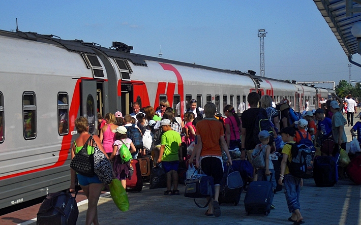 Состав поезда сформирован для перевозки детских групп к местам массового отдыха.