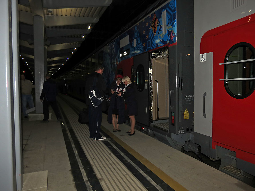Внутри поезда: верхние полки, как и положено, в фирменных поездах, были уже застелены. Комплекты постелей для первых полок, лежали на второй. Проводница (в нашем вагоне она была одна, в других вагонах было и по 2 проводника) прошла, предложила чай. Но поскольку комплект постельного белья уже был разложен, ей не пришлось выполнять эту процедуру в ходе поездки. Уже после отправления раздали пакетики с гигиеническим набором (зубная щётка, салфетка и пр…). Хотели было с женой сходить в вагон ресторан, но не пошли, так как сильно устали от поездок по олимпийским объектам. Легли спать.