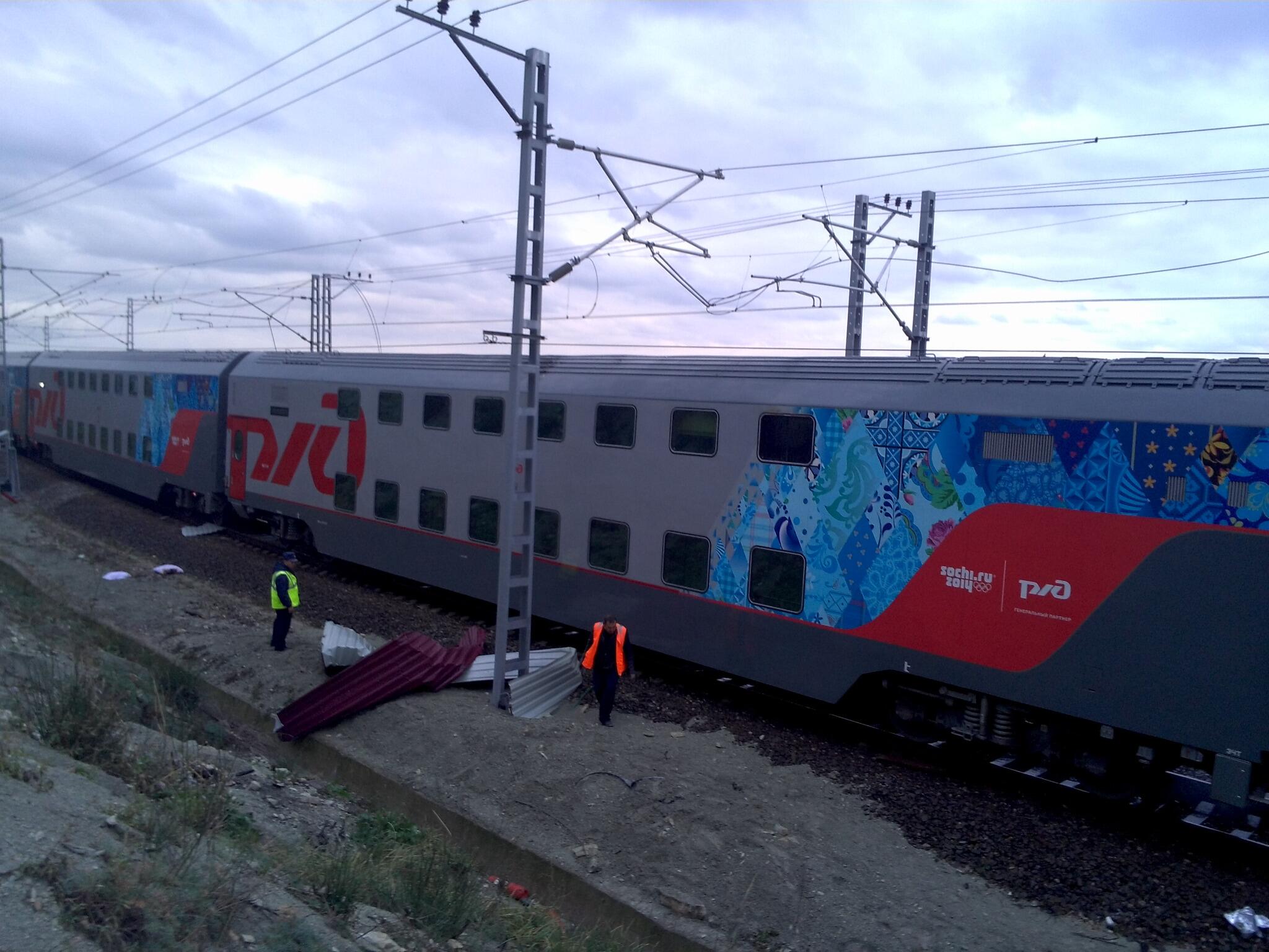 Машинист поезда №103/104 сообщением Москва - Адлер при следовании по перегону Шепси - Водопадный заметил в негабарите посторонний предмет на контактной сети. В соответствии с инструкцией было применено экстренное торможение, но расстояние было недостаточным и произошло падение предмета (лист металлопрофиля) на состав. В результате короткого замыкания возникло задымление в третьем вагоне с хвоста поезда. Оперативными действиями поездной и локомотивной бригады были предприняты все необходимые меры: пассажиры трех хвостовых вагонов переведены в вагоны головной части состава, вагоны отцеплены. Со станции Туапсе были подняты пожарный поезд и вспомогательные тепловозы. Задымление было устранено. Пострадавших нет.
