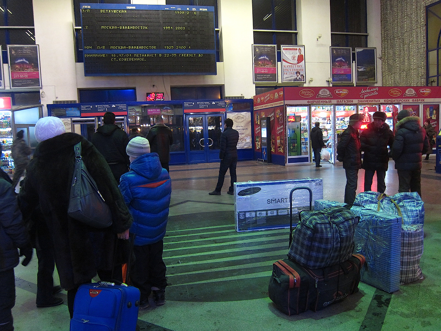 В ожидании "России" в центральном зале вокзала в Нижнем. Слева субъекты (с вещами) корейской наружности, ибо в хвосте состава наличествовали вагоны №№25 и 26 Москва - Туманган: