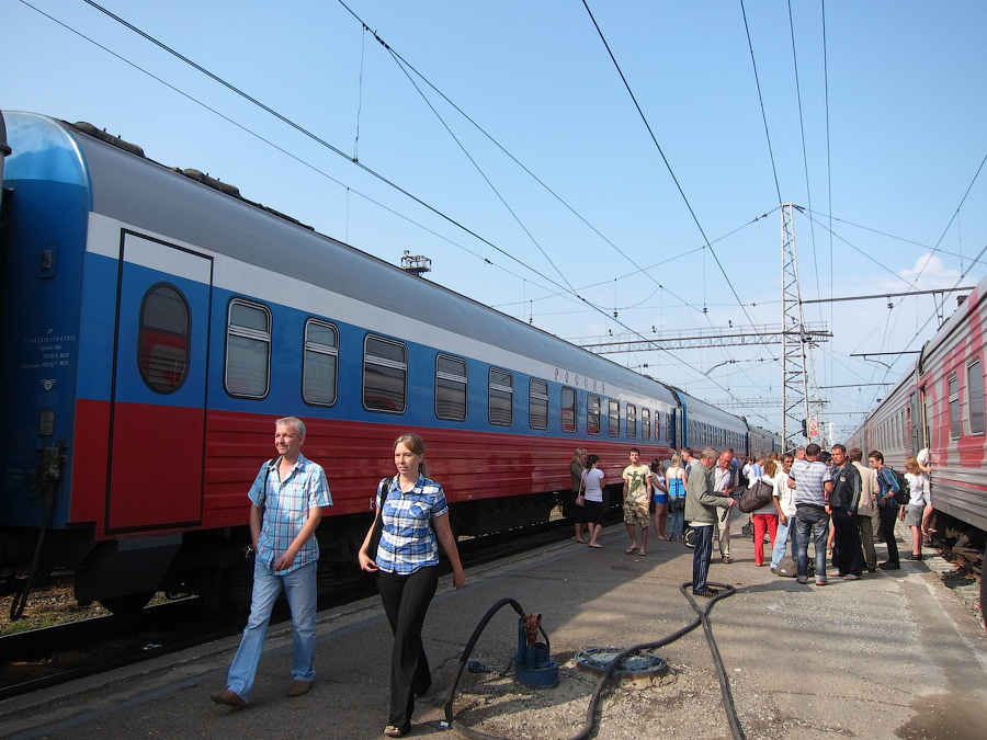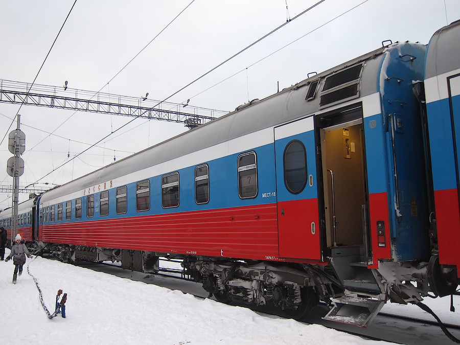 На этот раз в состав "России" были включены два купейных вагона №25 и №26 до Тумангана (пограничная железнодорожная станция с КНДР), явившие собой обычные тверские вагоны нового модельного ряда в том же фирменном триколоре "России". В центральном зале вокзала в Нижнем в ожидании "России" собралась толпища лиц этой самой корейской наружности: