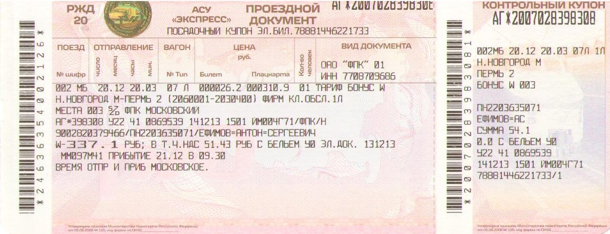 Антон Ефимов:Неплохо бы подытожить для ясности, что из перечня вновь запрашиваемой при оформлении билета информации (пол, гражданство, место рождения и дата рождения) на твердом бланке билета пропечатывается всё кроме места рождения. Порядок следования этой информации в пятой строке билета после ФИО пассажира: дата рождения, гражданство, пол (см. скан-пример). Последний параметр в пятой строке опционален - номер карты участника в программе лояльности «РЖД Бонус».