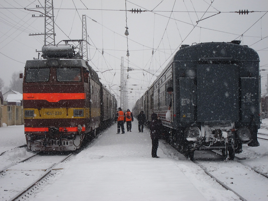 Снегопааад, снегопааад... "Россия" на ст. Балезино (состав справа) на смене электровоза сегодня, 08 декабря 2013 года. Слева состав одномаршрутного №099 Владивосток - Москва: