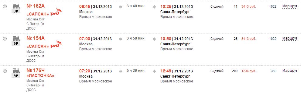 Ну что, уже есть возможность прикинуть эффективность назначения допов на пиковую дату 31 декабря на новогодние по маршруту Москва - Петербург. В этот день, судя по количеству проданных билетов, едет довольно много людей. Похоже, это так называемый офисный планктон, которому нужно попасть из Москвы в Петербург по окончании рабочей недели (а 31 еще официально многие работают). И это, конечно, всякая молодежь, которая решила рвануть в Питер на новый год.