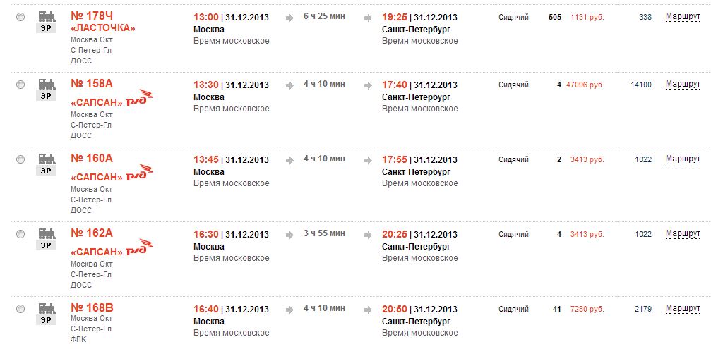 Ну что, уже есть возможность прикинуть эффективность назначения допов на пиковую дату 31 декабря на новогодние по маршруту Москва - Петербург. В этот день, судя по количеству проданных билетов, едет довольно много людей. Похоже, это так называемый офисный планктон, которому нужно попасть из Москвы в Петербург по окончании рабочей недели (а 31 еще официально многие работают). И это, конечно, всякая молодежь, которая решила рвануть в Питер на новый год.